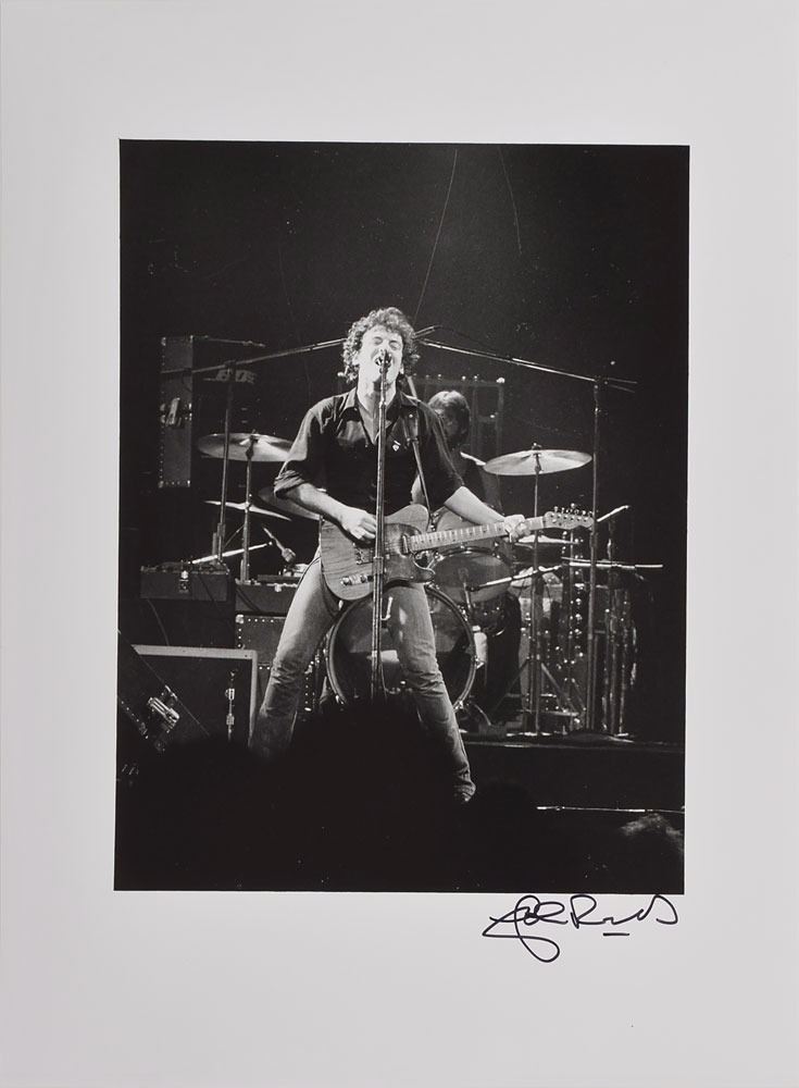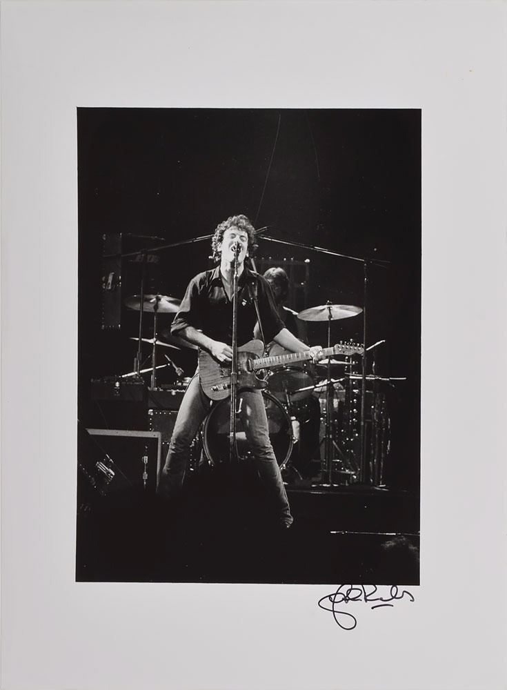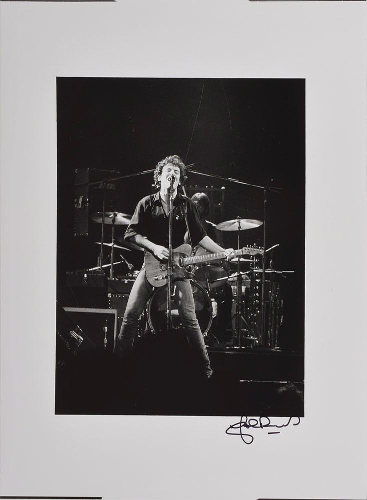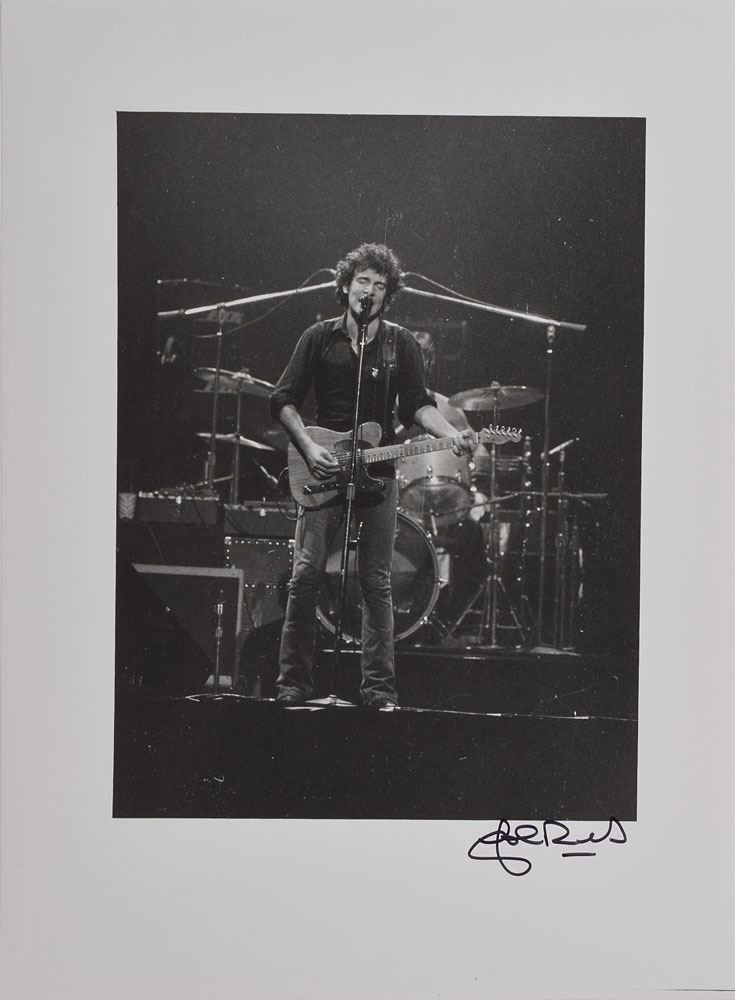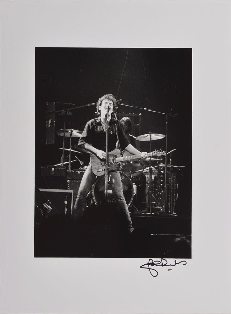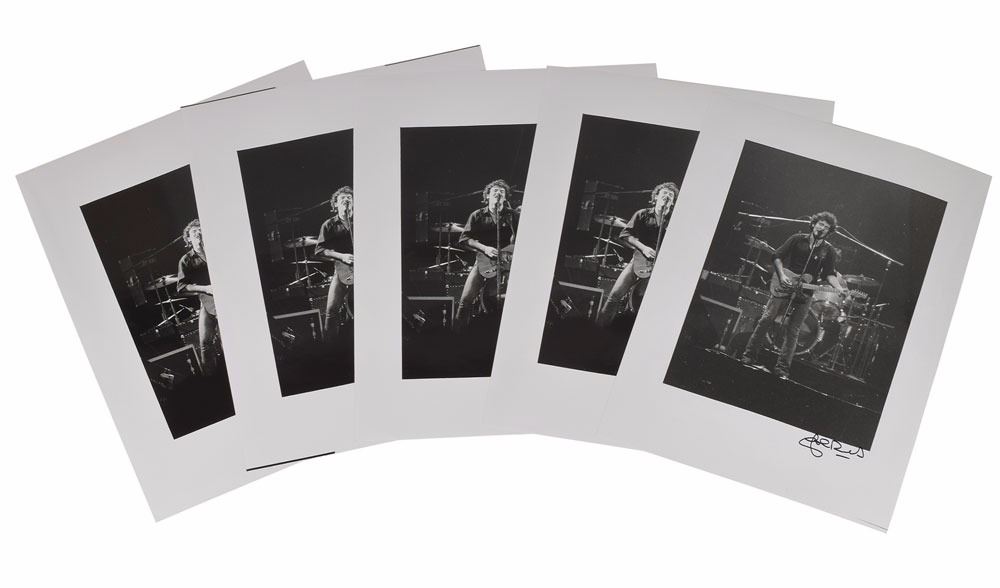 Five glossy photos of Bruce Springsteen, each signed in the lower border in black felt tip by photographer John Rowlands: a 14.5 x 19.25 full-length photo of Springsteen playing his guitar and singing on stage during a performance; and a set of four identical full-length photos of Springsteen in a more dramatic singing pose from the same concert, ranging in size from 14.5 x 19.5 to 15.25 x 20. In overall fine condition, with a dent to top left of one.