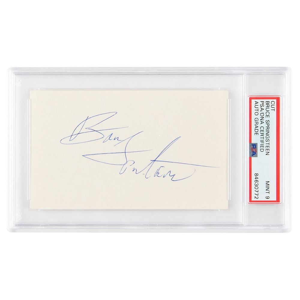 Neat, early ballpoint signature, “Bruce Springsteen,†on an off-white 5 x 3 card. In very fine condition. Encapsulated in a PSA/DNA authentication holder, grading the autograph as "MINT 9."