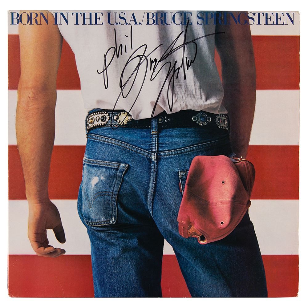 Born in the U.S.A. album by Bruce Springsteen, who has signed and inscribed on the front cover in black felt tip, "Phil, Bruce Springsteen." In fine condition. The record is included. The consignor notes that the autograph was obtained during the 1999 reunion tour in Boston, Massachusetts.