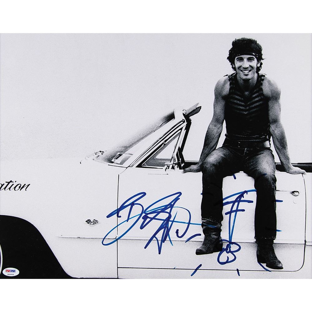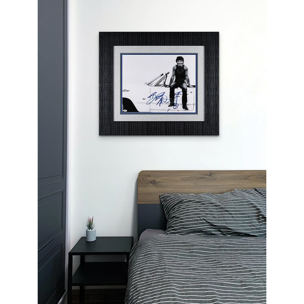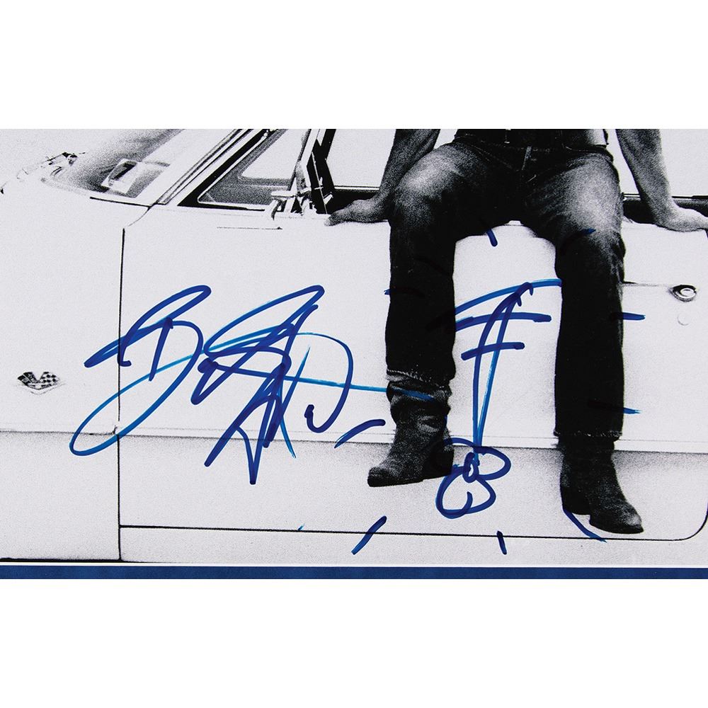 Satin-finish 19 x 15 photo of Bruce Springsteen as he appeared on the cover of his 1984 single 'Cover Me,' signed prominently in blue felt tip by Springsteen, who adds a sketch of a guitar. Impressively triple-matted and framed to an overall size of 31 x 27. In fine condition, with scattered small surface wrinkles, and a PSA/DNA label affixed to the lower right corner. Accompanied by a full letter of authenticity from PSA/DNA.