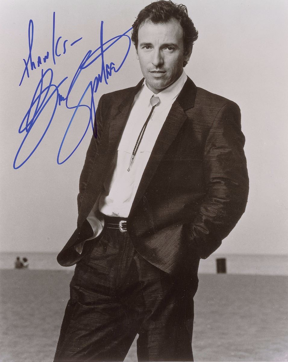 Glossy 8 x 10 photo of Springsteen wearing a suit and bolo tie, signed in blue felt tip, “Thanks—Bruce Springsteen.” In fine condition, with trivial surface impressions.