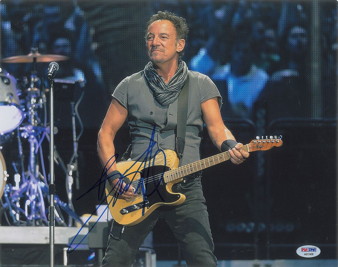 Color satin-finish 14 x 11 three-quarter-length photo of Springsteen playing his Fender Esquire guitar during a live performance, signed in blue felt tip. In fine condition. Accompanied by a full letter of authenticity from PSA/DNA.