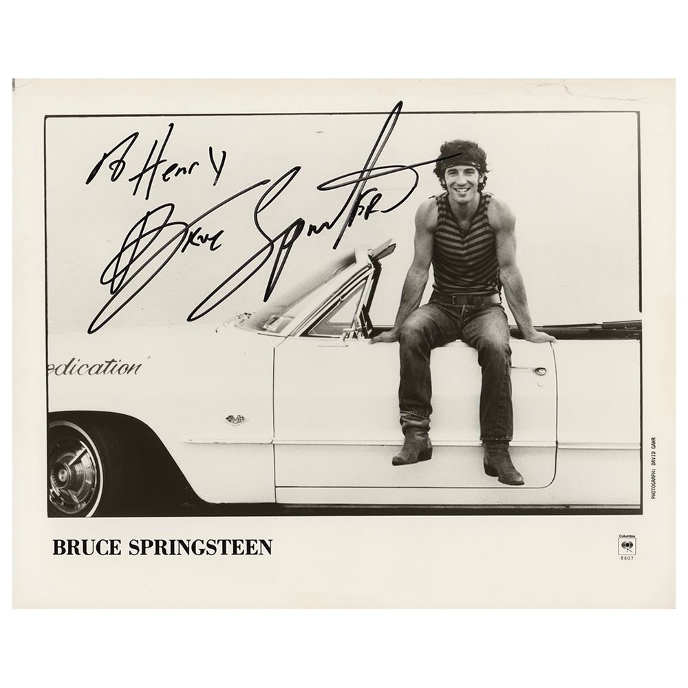Terrific glossy 10 x 8 Columbia Records publicity photo of Bruce Springsteen as he appeared on the cover of his 1984 single 'Cover Me,' signed and inscribed in black felt tip, "To Henry, Bruce Springsteen.†In very good to fine condition, with a thin crease touching Springsteen's face, and heavier creasing in the top border.