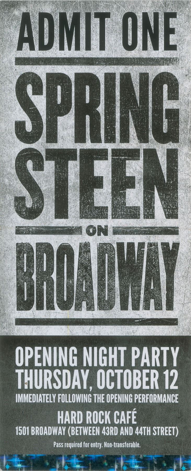 Playbill for Springsteen on Broadway at the Walter Kerr Theatre in October 2017, thirty-six pages, 5.5 x 8.5, signed on the front cover in blue felt tip. Includes an admission ticket for the 'Opening Night Party' at the Hard Rock Cafe on October 12th. In very good to fine condition, with moderate handling wear and a central vertical fold. Accompanied by a full letter of authenticity from REAL. This is the first signed playbill from Springsteen's new Broadway show that we have offered.
