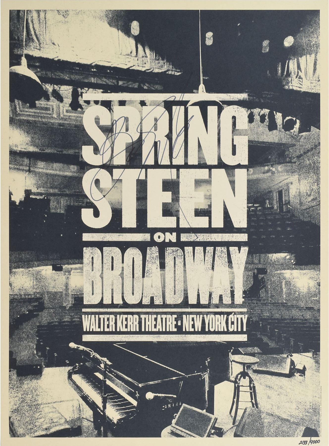 Very desirable limited edition 18 x 24 poster for the immensely popular Springsteen on Broadway concerts at the Walter Kerr Theatre in New York City, numbered 2133/4000, signed in black felt tip. In fine to very fine condition. Consignor notes that the signature was obtained outside of the Walter Kerr Theater on January 22, 2018.