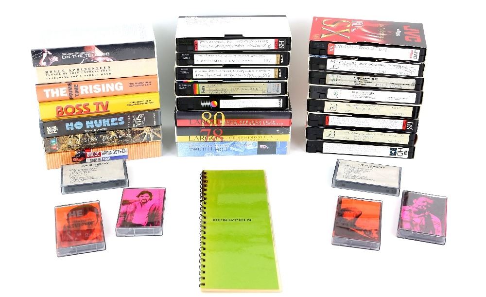 Bruce Springsteen - VHS Collection including all released material and rare performances such as 'No Nukes’ ‘A Vision Shared’ ‘Berlin 9th July 1995’ recorded in a cafe in what was East Berlin plus a menu from the cafe, Various other Bootleg concert tapes also some cassette bootlegs including Bruce performing with Joe Grushecky. Various home VHS tapes of TV performances taped over the years.