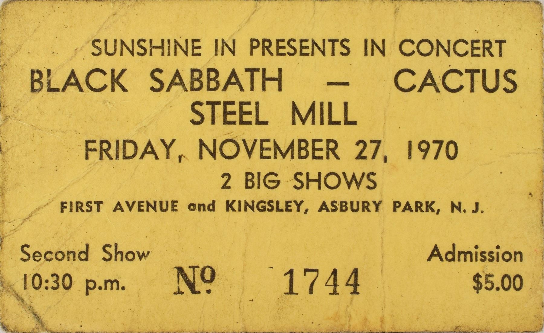 Exceedingly rare ticket stub for the second Black Sabbath/Cactus/Steel Mill show at the Sunshine In, Asbury Park, New Jersey, on November 27, 1970. In very good condition, with scattered creasing and soiling, and a phone number notation to reverse. Accompanied by a modern color glossy photo of Springsteen. Steel Mill, which featured the 21-year-old Springsteen as its frontman, was the opening act for the triple-bill; during the early show, there was a power failure halfway through their 14-minute rendition of 'Dancing in the Streets,' prompting the frustrated Springsteen to exclaim, 'We must be the guinea pigs here tonight.' Black Sabbath was fronted by Ozzy Osbourne, who reportedly received death threats before the show. This incredible pairing of music legends—both very early in their respective careers—makes this a truly remarkable piece.
