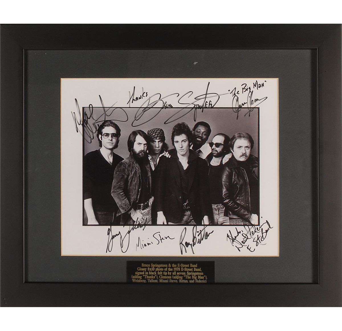 Glossy 10 x 8 group photo, signed in black felt tip by Bruce Springsteen, adding “Thanks”; Clarence Clemons, adding “The Big Man”; Steve Van Zandt, signing “Miami Steve”; Roy Bittan; Garry Tallent; Max Weinberg; and Dan Federici. Matted and framed to an overall size of 15.75 x 13. In fine condition.
