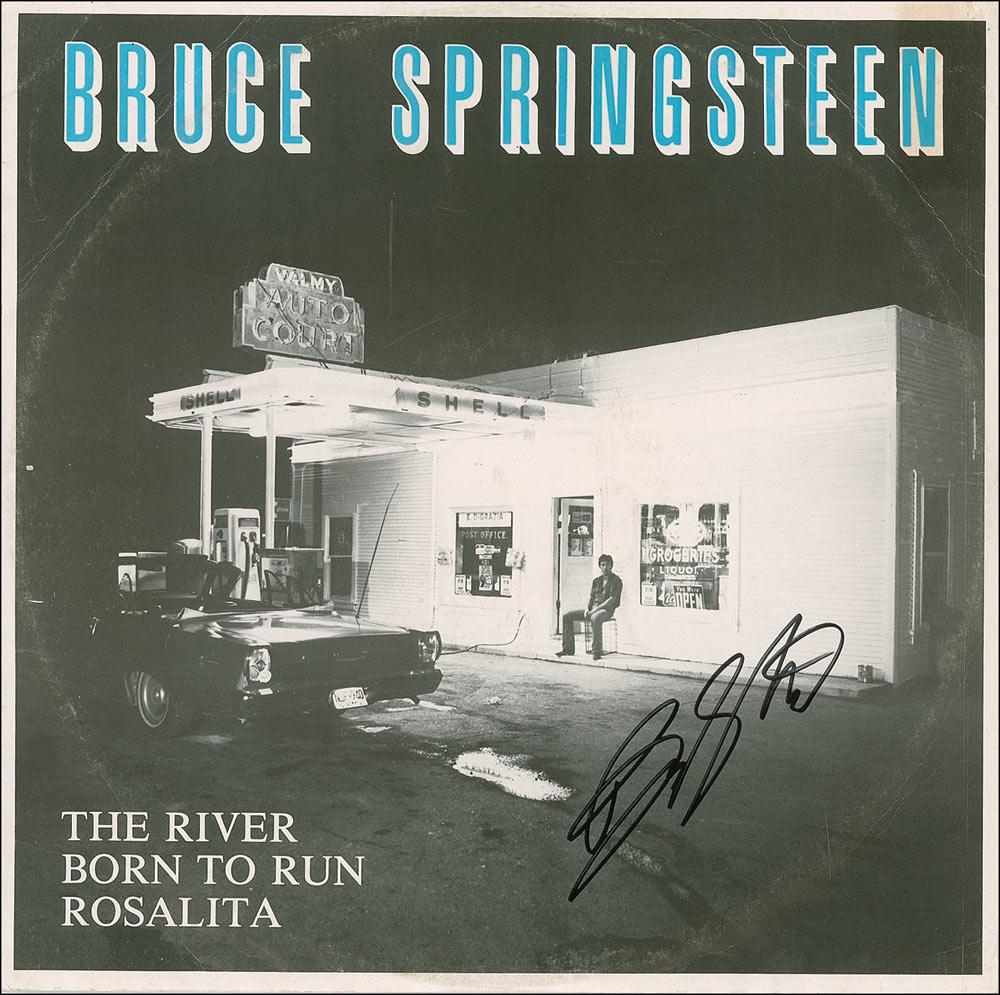 The River 12” single album sleeve signed in black felt tip by Springsteen. Album contains three songs ‘The River,’ ‘Born To Run,’ and ‘Rosalita,’ and album sleeve also bears tour information from their 1981 tour of England. Album impression to signed side, and light corner creasing and toning, otherwise fine condition. The record is included.