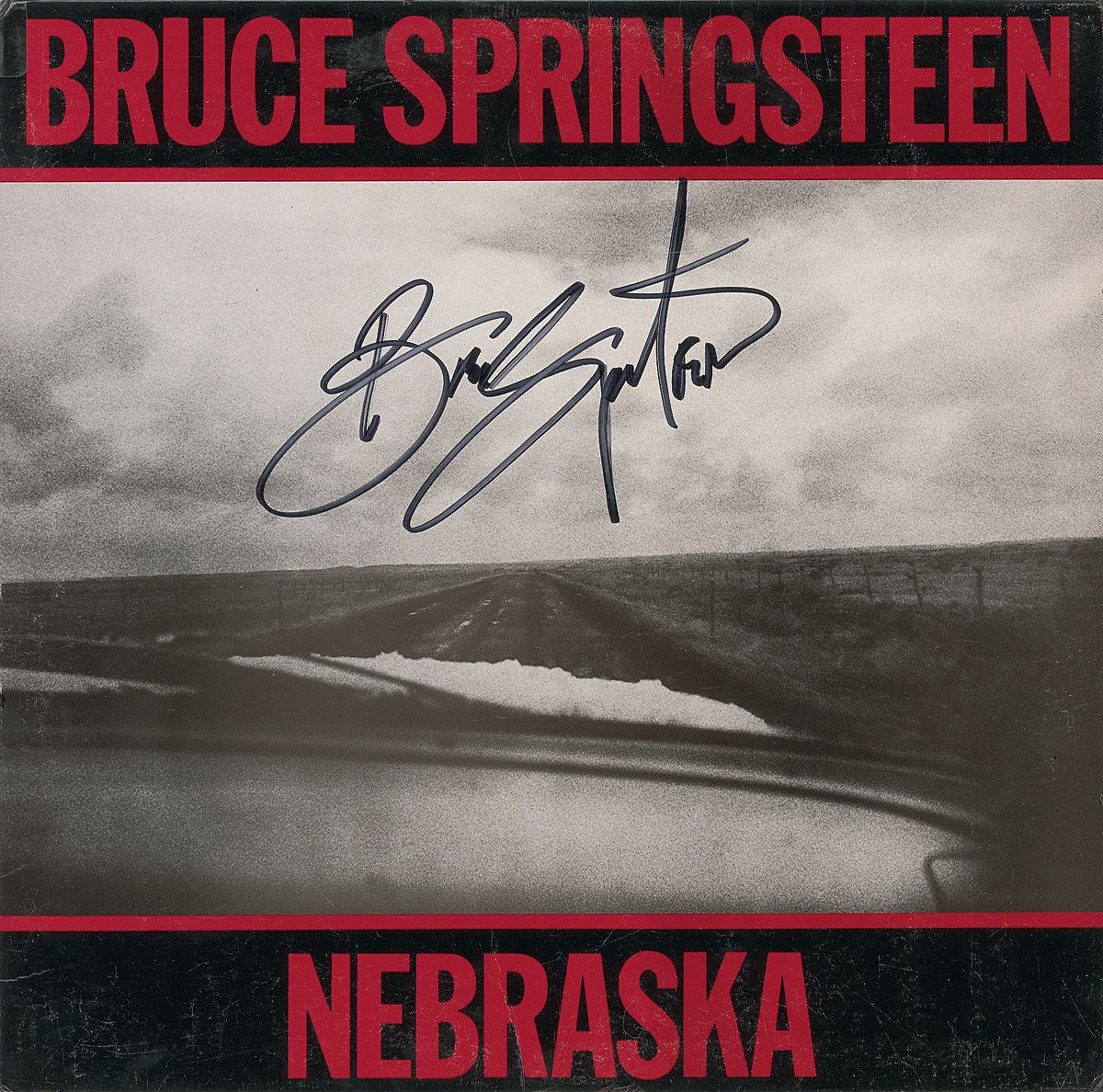 Nebraska album beautifully signed on the front cover in black felt tip. In fine condition, with a few light creases to the edges and a small piece of tape to the upper left corner. The record is included.