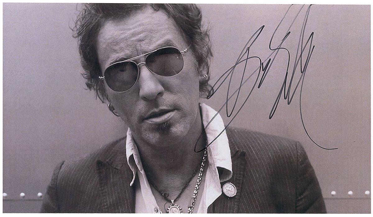 Great 10.75 x 6 cardstock photo of Springsteen in sunglasses, signed in black felt tip. Lightly trimmed edges, slightly affecting the top of the signature, otherwise fine condition.