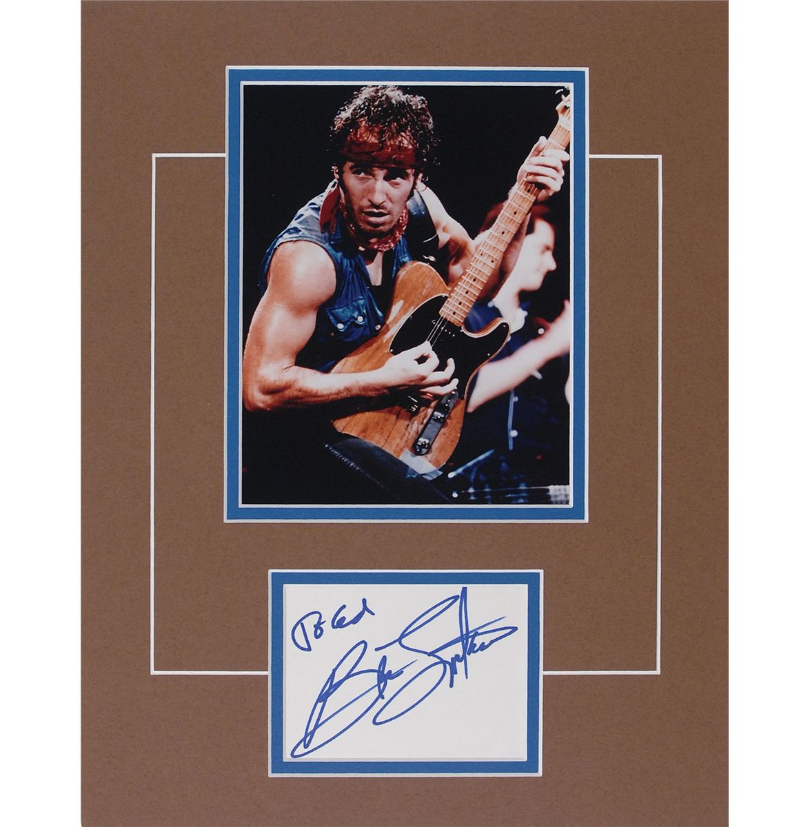 Felt tip signature and inscription, “To Ed, Bruce Springsteen,” on an off-white 4 x 3 card. Matted with a photo of Springsteen playing his guitar to an overall size of 11 x 14. In fine condition.