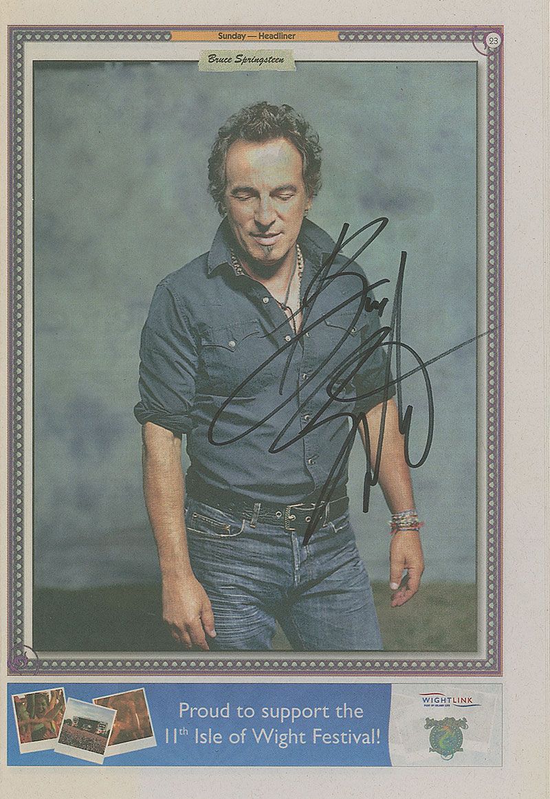 Program for the Isle of Wight Festival on June 22, 2012, 8 x 11.5, 31 pages, signed inside in black felt tip by Springsteen. In fine condition. Accompanied by Springsteen’s personal laminated festival stage pass and his empty bag of Walkers Crisps, acquired from the captain of Springsteen’s private chartered boat that brought him to and from the island.
