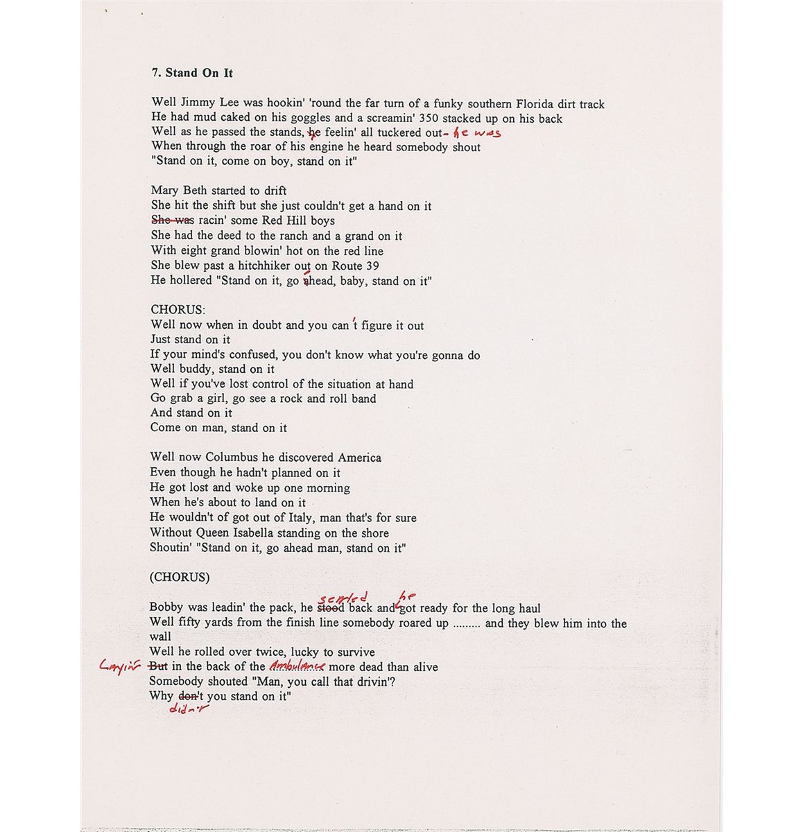 Typed lyrics to ‘Stand On It,’ one page, 8.5 x 11, hand-corrected throughout in red ink by Springsteen. Springsteen makes brief corrections on seven different lines, including five words in the final verse: “seemed,” “he,” “Layin’,” “Ambulance,” and “didn’t.” In fine condition. He first recorded this song in 1986, releasing it as the B-side of the ‘Glory Days’ single on September 15, 1986.