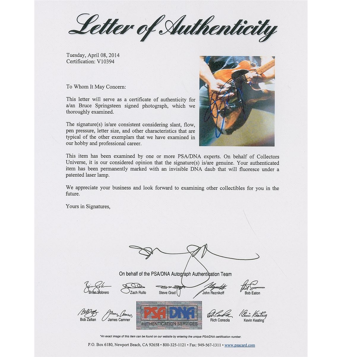 Color 20 x 30 laser print photo of Springsteen on stage, circa Born in the USA, signed in blue felt tip. In fine condition, with a few scattered light creases and surface marks. Accompanied by a full letter of authenticity from PSA/DNA.