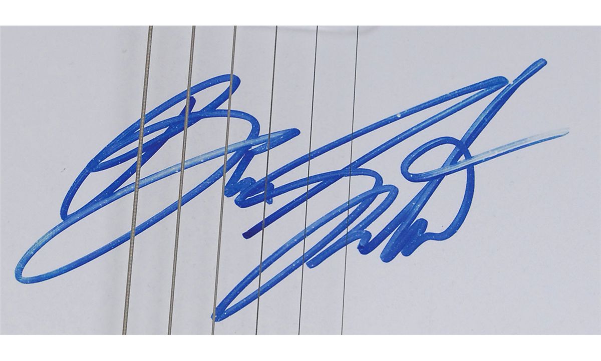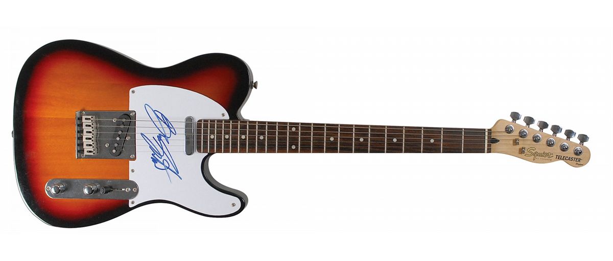 Sunburst-finish Fender Squier ‘telecaster-style’ electric guitar, signed on the white pickguard in blue felt tip. In fine condition.