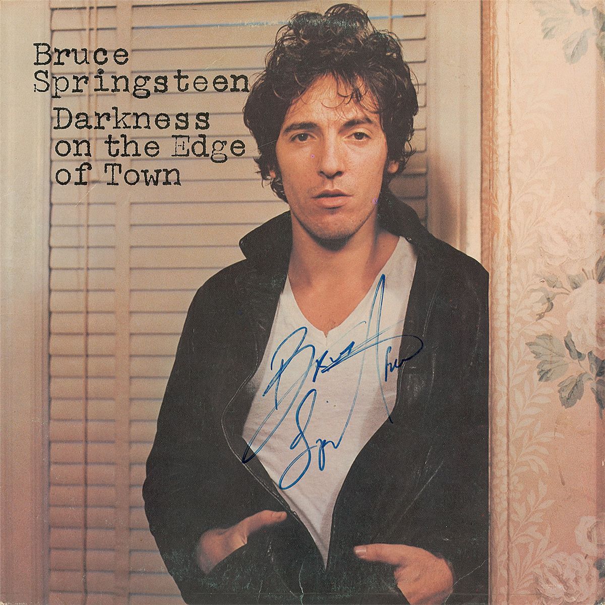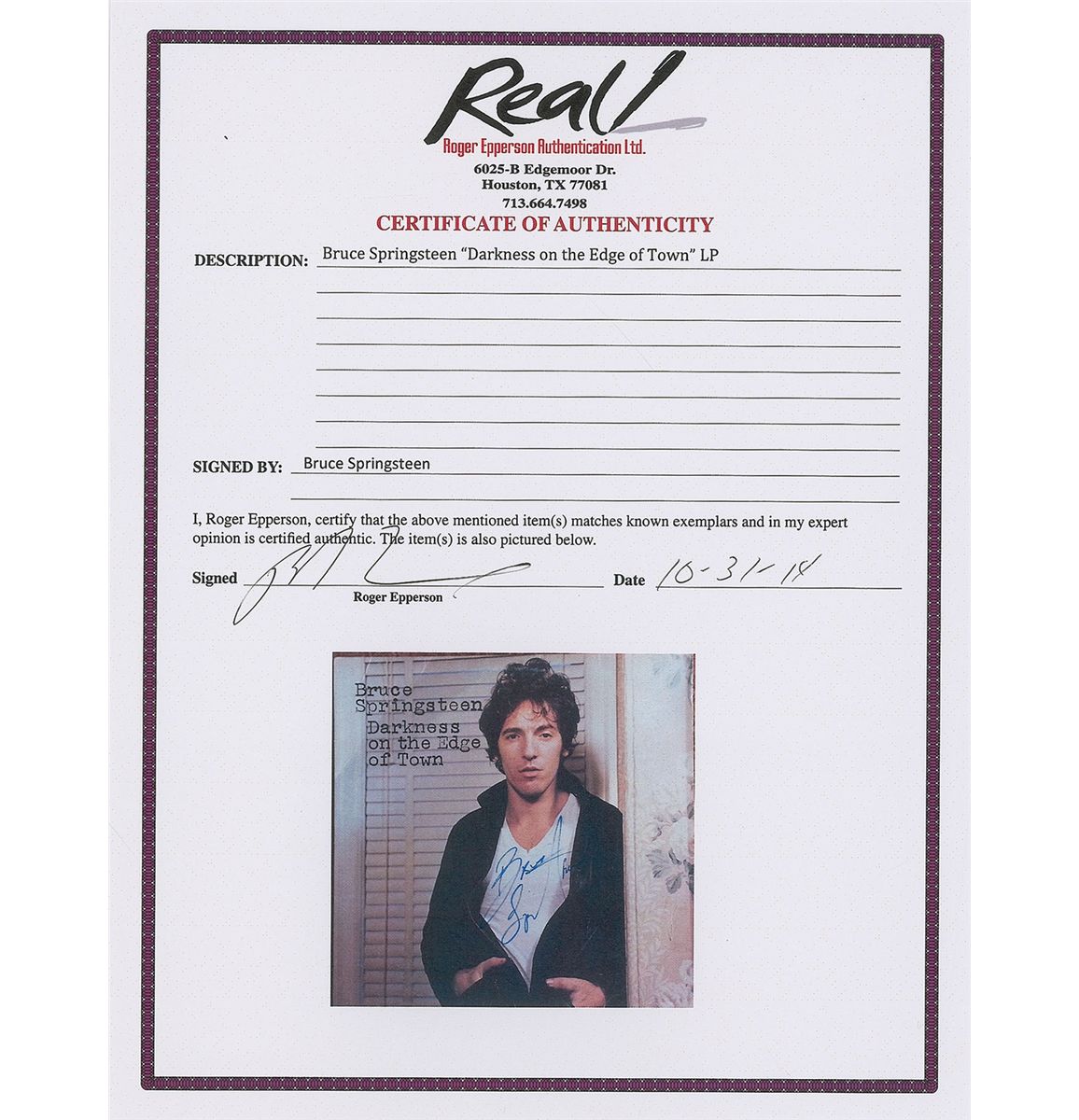 Darkness on the Edge of Town album signed on the front cover in blue felt tip. In very good condition, with several noticeable creases and some irregular adhesion to the signature. The record is not included. Accompanied by a full letter of authenticity from Roger Epperson/REAL. An excellent late 1970s example of his signature, much more complete and crisp than more recent autographs.