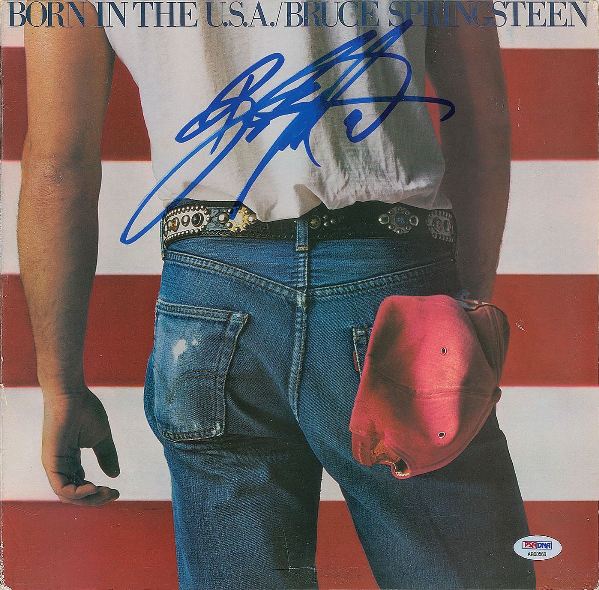 Exceptional Born in the U.S.A. album prominently signed on the front cover in bold blue felt tip by Springsteen. In fine condition. The record is not included. Accompanied by a full letter of authenticity from PSA/DNA.