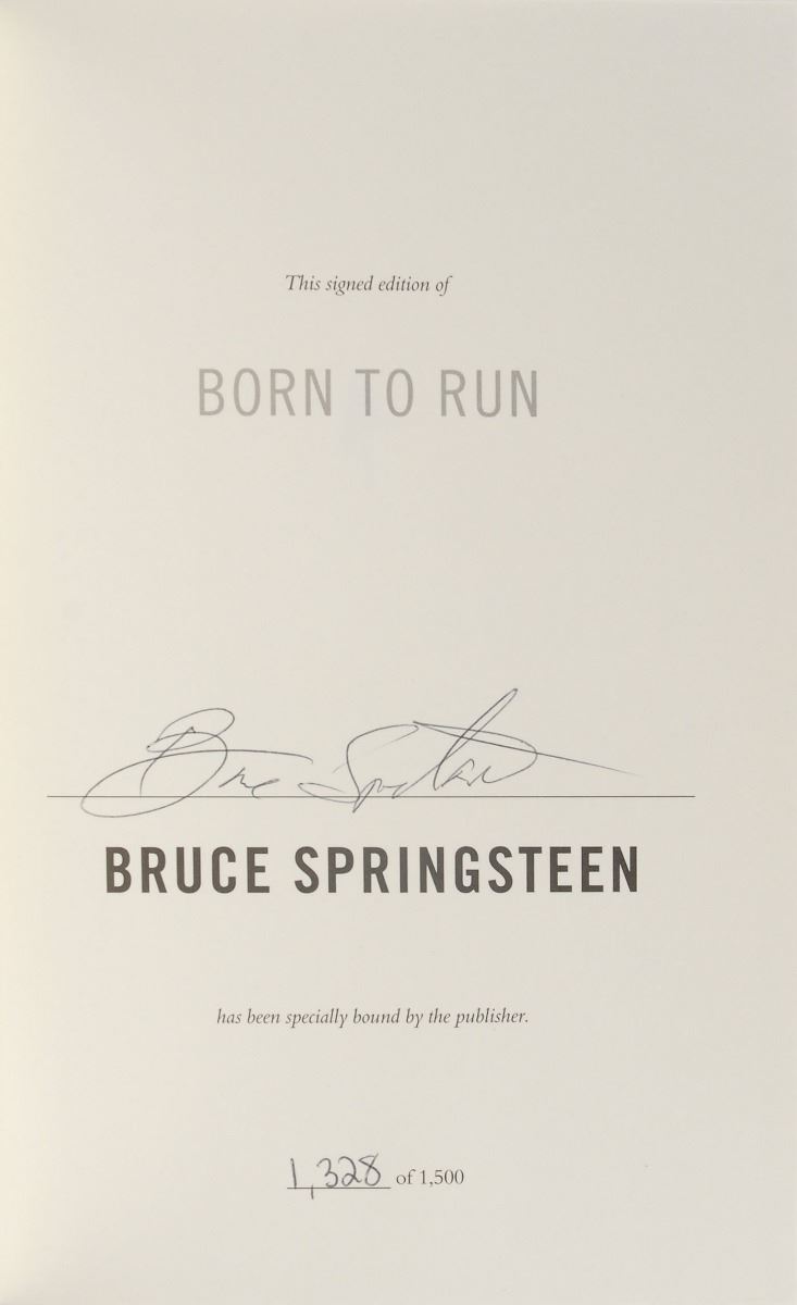 Signed book: Born to Run. First edition, limited issue, numbered 1328/1500. NY: Simon & Schuster, 2016. Hardcover with clamshell case, 8.75 x 11.75, 510 pages. Signed on the colophon in black ballpoint. Includes the Chapter and Verse CD. In very fine condition.