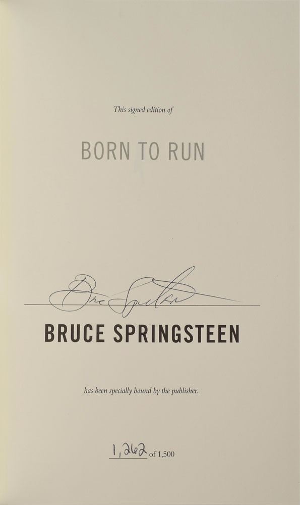 Signed book: Born to Run. First edition, limited issue, numbered 1262/1500. NY: Simon & Schuster, 2016. Hardcover with clamshell case, 8.75 x 11.75, 510 pages. Signed on the colophon in black ballpoint. Includes the Chapter and Verse CD. In very fine condition.