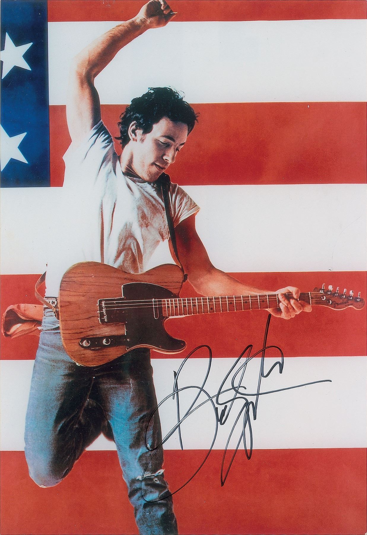 Color glossy 8.25 x 12 photo of Springsteen playing his Fender Esquire guitar against an American flag backdrop, signed in black felt tip. In fine condition.