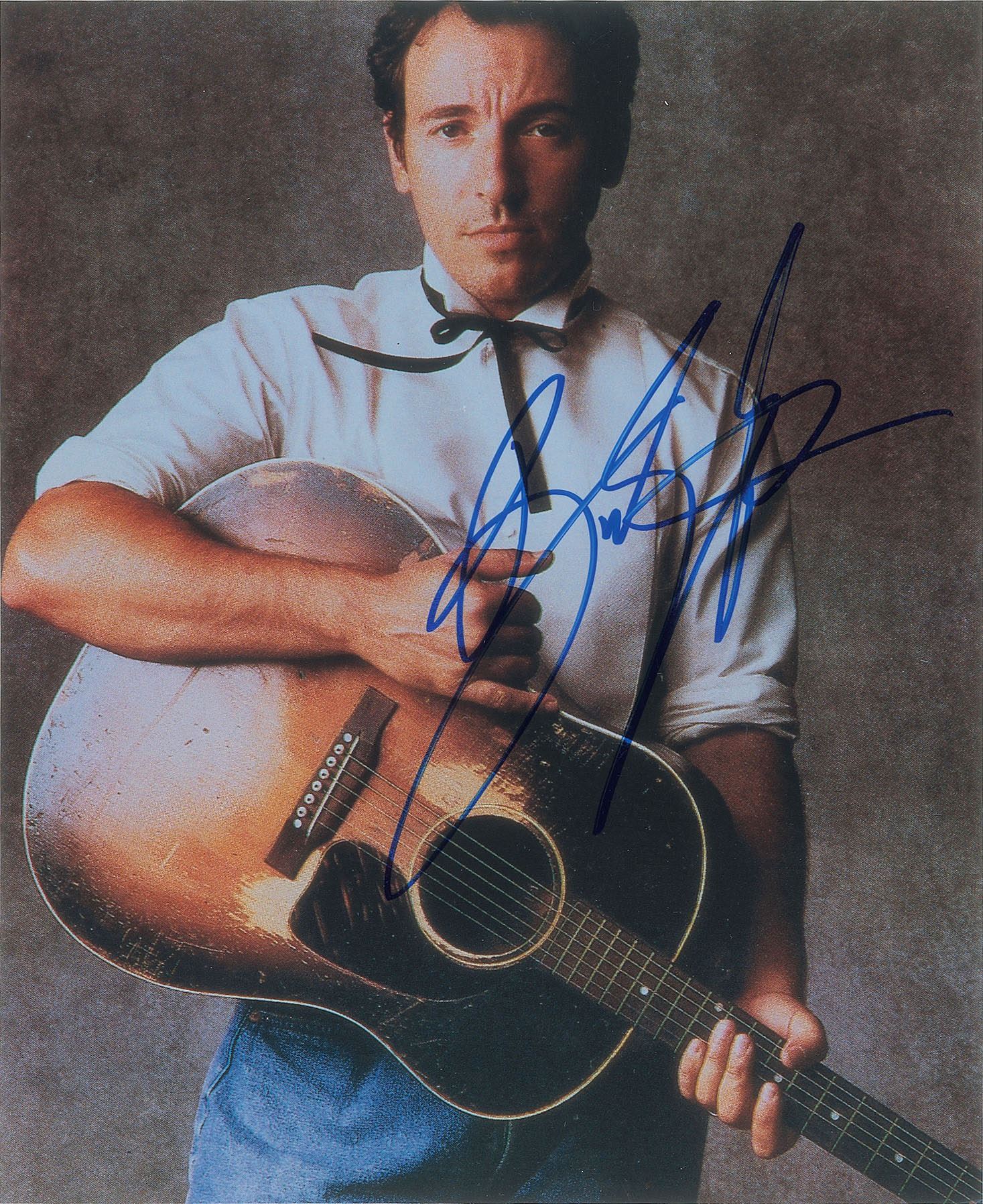 Color glossy 8 x 9.75 photo of Springsteen holding his Gibson J-45 acoustic guitar, signed in blue felt tip. In very fine condition.