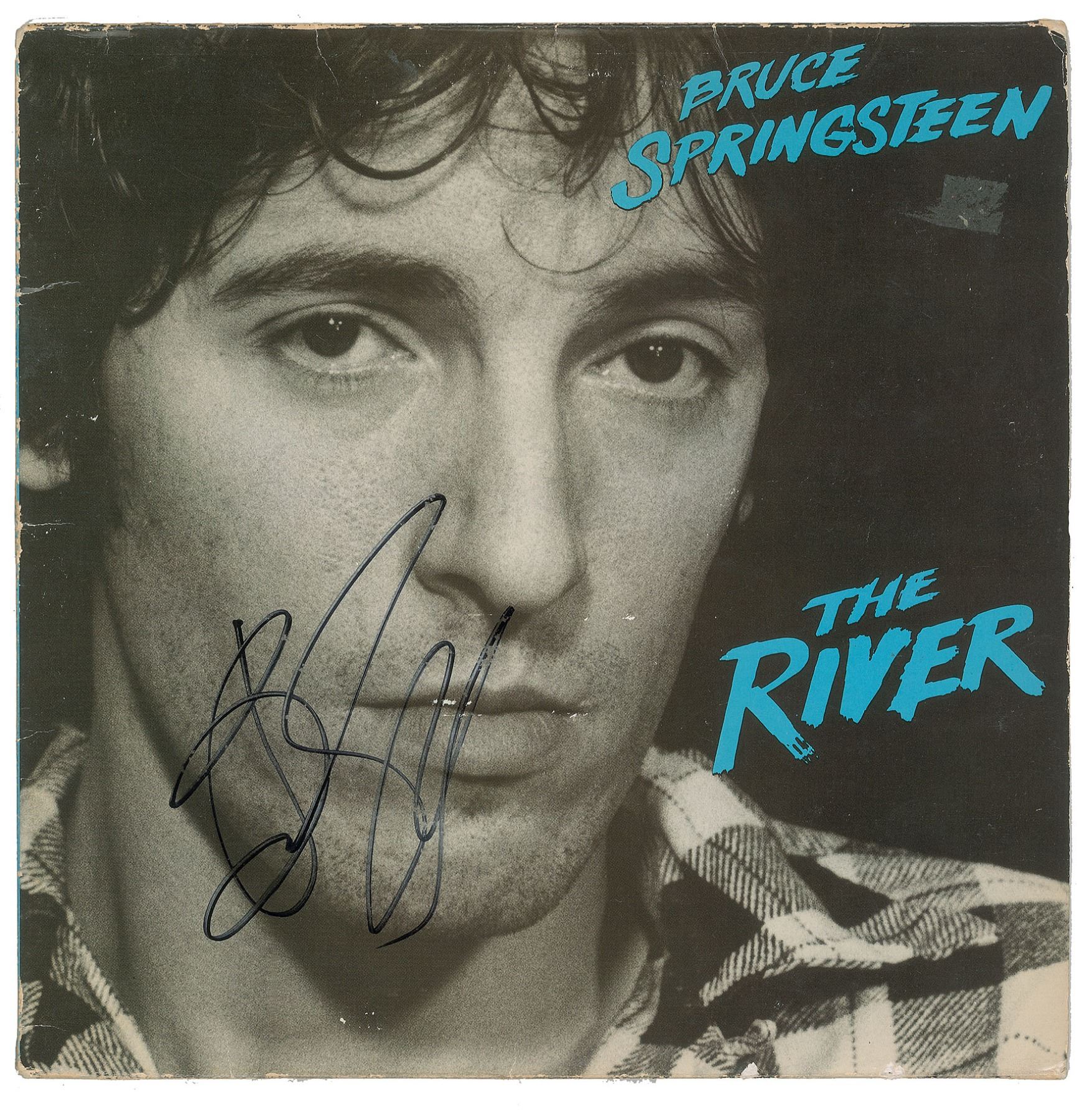 The River album signed on the front cover in black felt tip by Springsteen. In very good condition, with creasing, edge wear, and old price sticker residue. The record is not included.