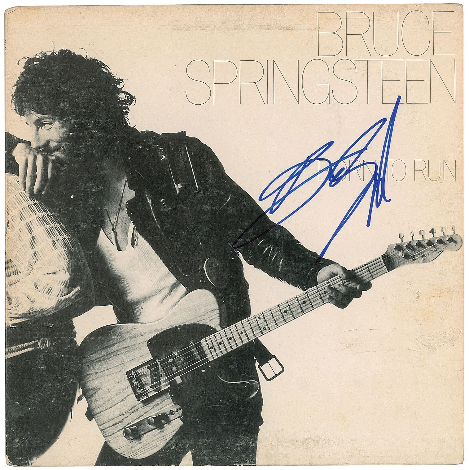 Born to Run album signed on the front cover in blue felt tip by Bruce Springsteen. In very good to fine condition, with light scuffing and soiling, and a light blue stain to the back cover. The record is included.