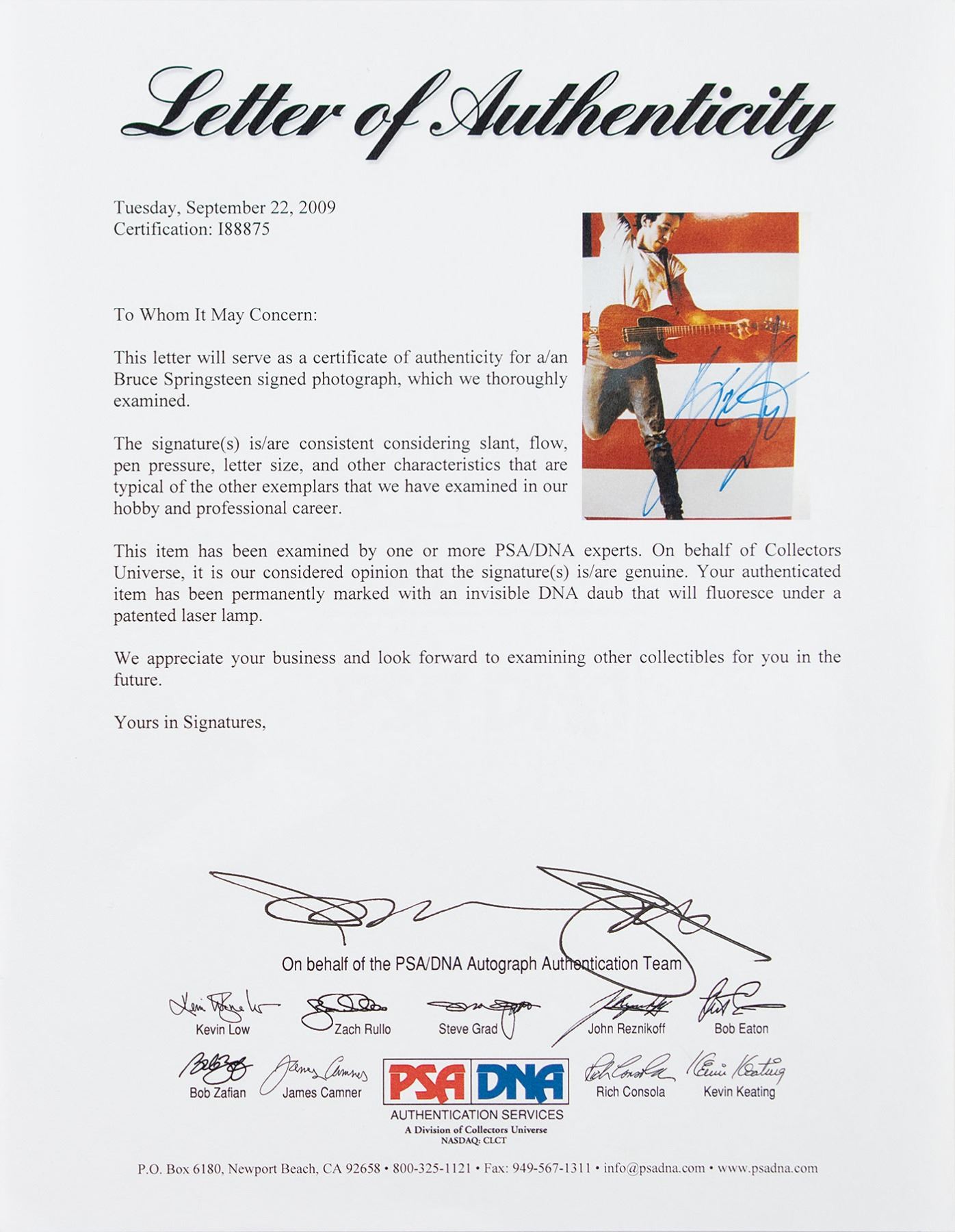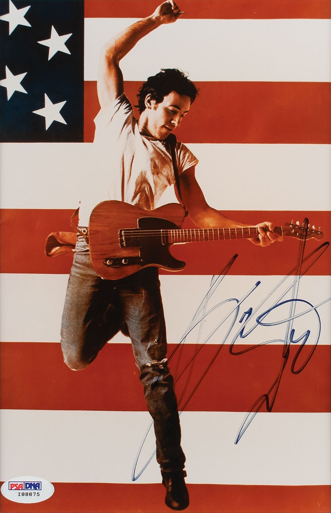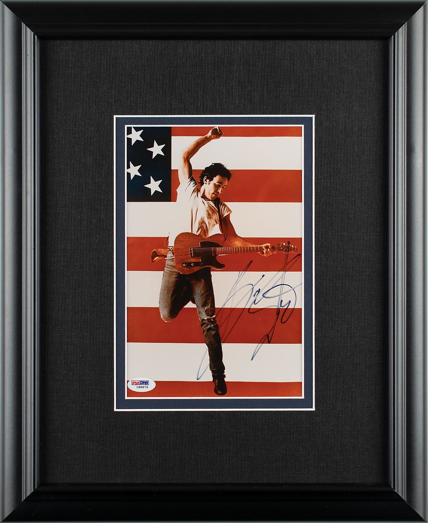 Color glossy 6.25 x 9.5 full-length photo of Bruce Springsteen as he's pictured on the cover of his 1984 hit single 'Born in the U.S.A,' signed in black felt tip. Double-matted and framed to an overall size of 15.25 x 18.75. In fine condition, with a PSA/DNA label affixed to lower left corner. Accompanied by a full letter of authenticity from PSA/DNA.
