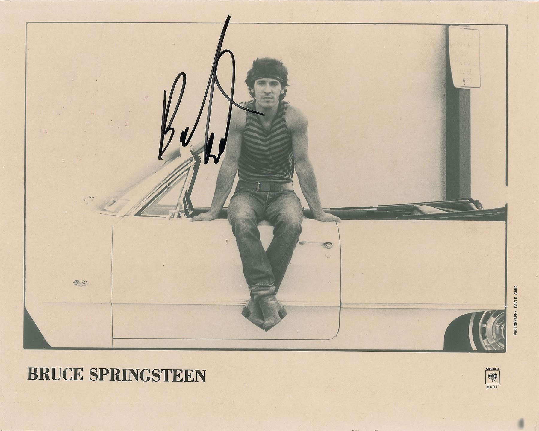 Glossy 10 x 8 Columbia Records promotional photo of Bruce Springsteen as he's pictured on the cover of his 1984 single 'Cover Me,' signed in black felt tip. In fine condition, with a few small surface creases. Accompanied by a full letter of authenticity from JSA.