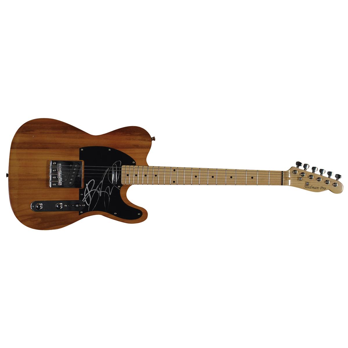 Wood-finish Stedman Pro ‘telecaster-style’ electric guitar, signed on the black pickguard in silver ink by Springsteen. In fine condition, with a trivial fingerprint brush to a single stroke of signature. Oversized.