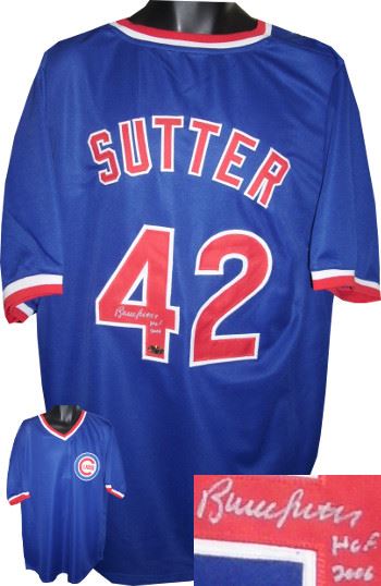 One of the sport's dominant relievers in the late 1970s and early 1980s, Bruce Sutter became the only pitcher to lead the National League in saves five times (1979–1982, 1984), and retired with 300 saves – at the time, the third highest total in history, behind Rollie Fingers (341) and Rich "Goose" Gossage (302), and an NL record until broken by Lee Smith in 1993; Sutter had set the NL record in 1982 with his 194th save, surpassing the mark held by Roy Face. In his first nine seasons, only Kent Tekulve made more appearances, and he saved 133 of the Chicago Cubs' 379 wins between 1976 and 1980. In 1979, Sutter won the NL's Cy Young Award as the league's top pitcher. He was inducted into the Baseball Hall of Fame in Cooperstown in 2006. Bruce Sutter has hand signed this Chicago Cubs Blue Prostyle TB jersey with HOF 2006 inscription. MAB Hologram and Certificate of authenticity from Athlon Sports.