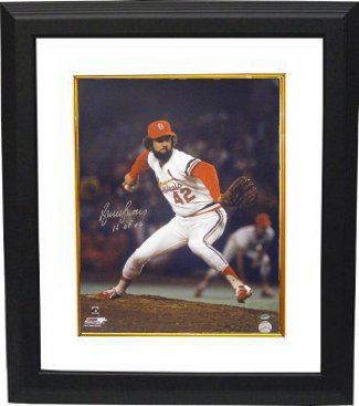 One of the sport's dominant relievers in the late 1970s and early 1980s, Bruce Sutter became the only pitcher to lead the National League in saves five times (1979–1982, 1984), and retired with 300 saves – at the time, the third highest total in history, behind Rollie Fingers (341) and Rich "Goose" Gossage (302), and an NL record until broken by Lee Smith in 1993; Sutter had set the NL record in 1982 with his 194th save, surpassing the mark held by Roy Face. In his first nine seasons, only Kent Tekulve made more appearances, and he saved 133 of the Chicago Cubs' 379 wins between 1976 and 1980. In 1979, Sutter won the NL's Cy Young Award as the league's top pitcher. He was inducted into the Baseball Hall of Fame in Cooperstown in 2006. Bruce Sutter has hand signed this St. Louis Cardinals 16x20 Photo with HOF 06 inscription. Leaf Authentics Hologram and Certificate of authenticity from Athlon Sports. Custom White Mat and Premium Black Frame as shown.