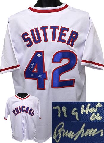 One of the sport's dominant relievers in the late 1970s and early 1980s, Bruce Sutter became the only pitcher to lead the National League in saves five times (1979–1982, 1984), and retired with 300 saves – at the time, the third highest total in history, behind Rollie Fingers (341) and Rich "Goose" Gossage (302), and an NL record until broken by Lee Smith in 1993; Sutter had set the NL record in 1982 with his 194th save, surpassing the mark held by Roy Face. In his first nine seasons, only Kent Tekulve made more appearances, and he saved 133 of the Chicago Cubs' 379 wins between 1976 and 1980. In 1979, Sutter won the NL's Cy Young Award as the league's top pitcher. He was inducted into the Baseball Hall of Fame in Cooperstown in 2006. This is a Bruce Sutter Chicago Cubs unsigned TB White unlicensed custom-prostyle jersey with twill stitched nameplate and numbers with dual 79 CY and HOF 06 inscriptions. JSA Hologram and Certificate of authenticity.