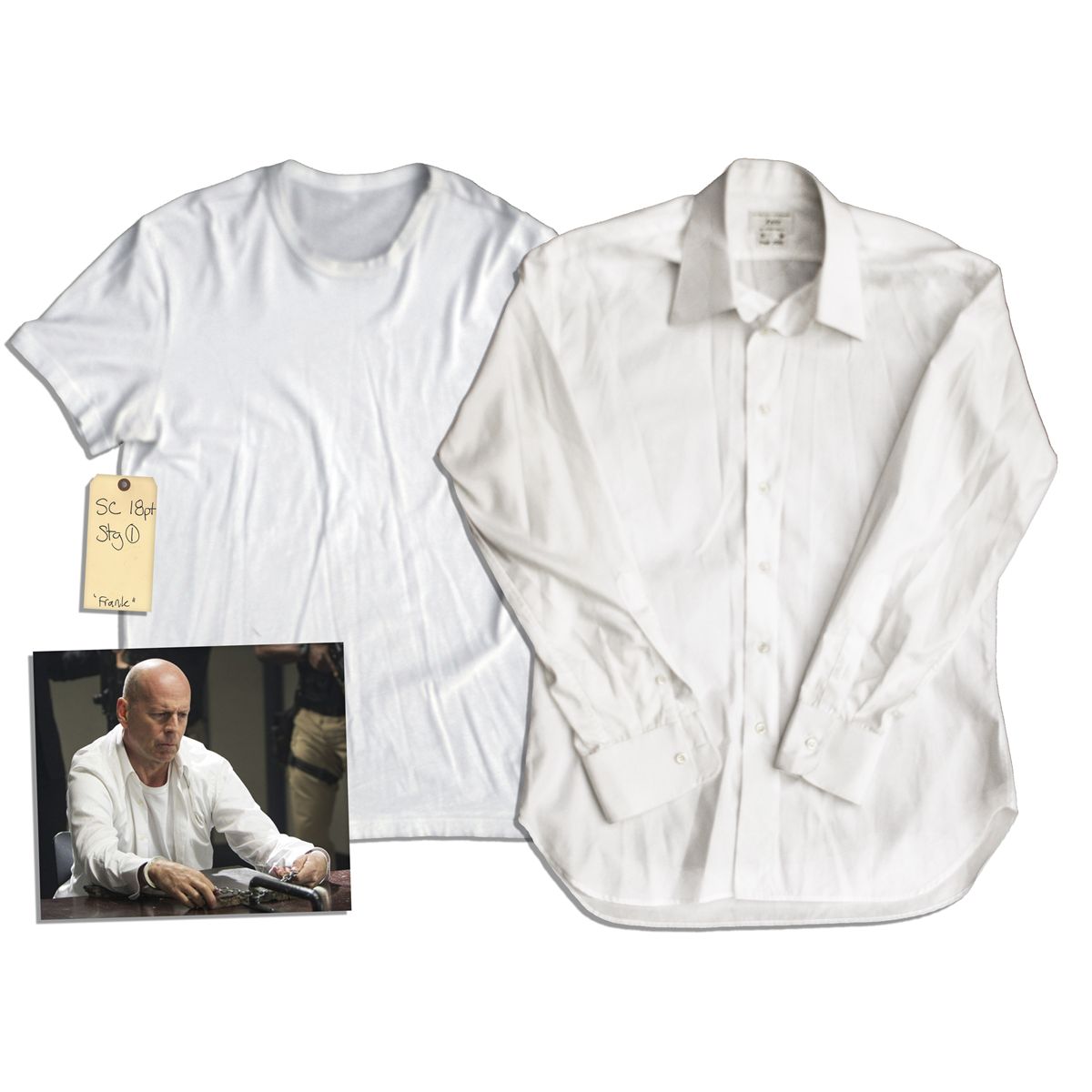 Bruce Willis screen-worn wardrobe lot from ''Red 2'', comprising a dress shirt and plain white t-shirt. Custom white dress shirt by Anto Beverly Hills has the actor's initials and date embroidered on the label, ''BW / Sept 2012''. Measures 22'' across the chest. Cotton t-shirt by James Perse is a size 2. Shirts are near fine. Accompanied by wardrobe department's tag and a COA from Premiere Props.