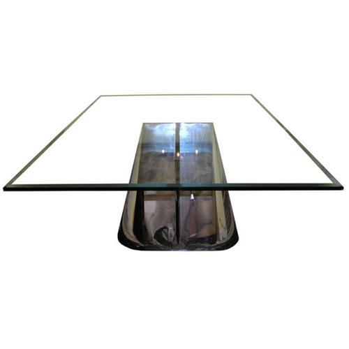 </font></strong>This is the Pinnacle Table designed by J. Wade Beam for Brueton. This classic modern design features a polished stainless steel conical center pedestal intersected by 3/4" thick glass in a semicircular plane. The top is 3/4" thick glass with a 1" beveled edge. Measures 78" (6.5') long by 48 (4') wide by 29" high. This table has a list price of $17,599 and is currently offered by Brueton dealers for as low as $11,735. Condition is good. There are various light scratches on the table top, and a chip from the underside of one corner and a flake chip from the underside of the edge on one end. There are no dents or deep scratches to the pedestal, but numerous light scratches. We suspect a thorough polishing of the base will hide or remove many of these light scratches.