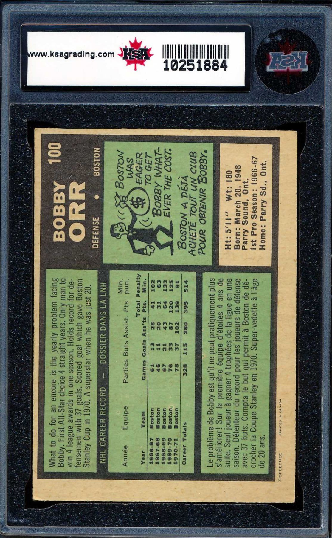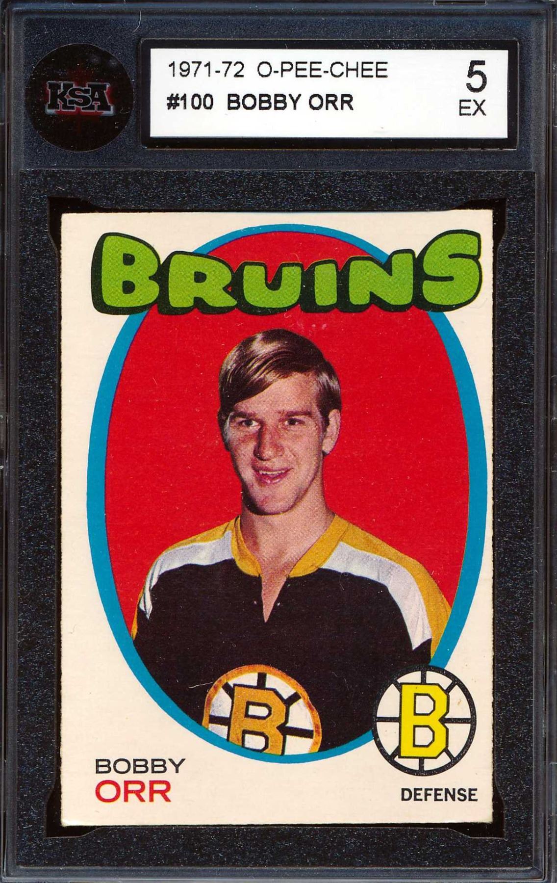 Bruins Bobby Orr #4 (1971-72) Card # 100, printed by O-Pee-Chee graded KSA: EX-5.