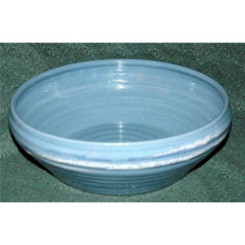 Lovely large heavy blue coiled pottery bowl. It made by a local family owned potter in Seattle: Bruning Pottery. The style is coiled. The sides have a foaming looking drip glaze. It does have some felt pads on the bottom so as to not scrach fine furniture. <p> It measures 11 1/2 across and 4 3/4" high. <p> I will make a lovely decorative peice to hold a house plant, keys and miscelaneous items. Plus I would think it suitable to be used to serve food in as well.