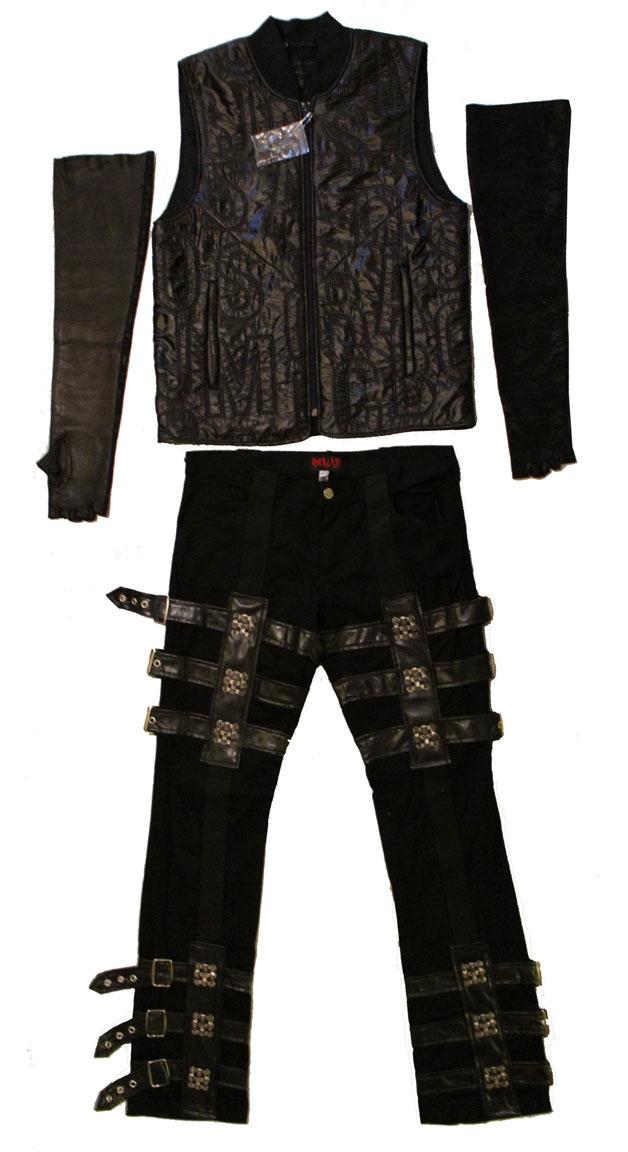 Three-piece ''goth'' costume, worn by Sacha Baron Cohen in the 2009 satiric comedy ''Bruno.'' Costume includes: (1) Marc Jacobs XL black polyester vest, (2) black pleather arm-length gloves, and (3) Aderlass 32'' black cotton pants with pleather leg straps and decorative spikes. Near fine condition.