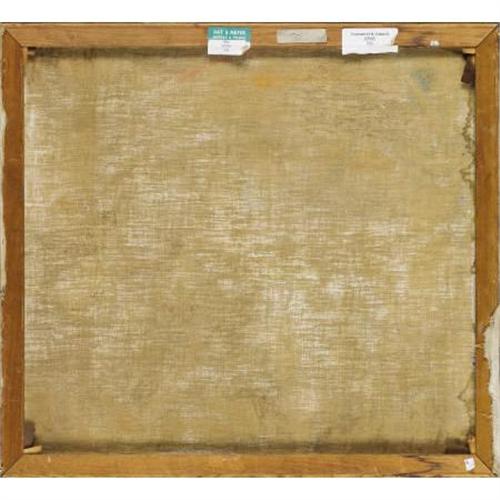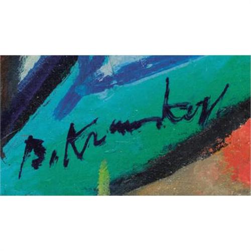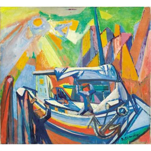 <B>BRUNO KRAUSKOPF (German, 1892-1960)</B></I><BR><I>Two Mates Lowering the Sail</B></I><BR>Oil on canvas<BR>32 x 35 inches (81.3 x 88.9 cm)<BR>Signed lower right: <I>B. Krauskopf</B></I><BR> <BR>PROVENANCE:<BR>Mrs. Bruno Krauskopf;<BR>Private collection, New York, New York<B>Condition Report:</B> Original canvas, unframed, minor craquelure throughout sun rays, otherwise excellent condition.<BR><BR><b>Shipping:</b> Requires 3rd Party Shipping (<a target="_blank" href="http://www.heritageauctions.com/common/shipping.php">view shipping information</a>)