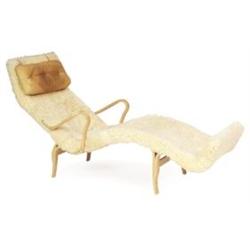 Bruno Mathsson Pernilla 3 chaise lounge, by Dux, molded birch frame with original sheepskin upholstery and tan leather headrest cushion, signed with burned marks, 26.5”w x 68”d x 36”h, very good conditio