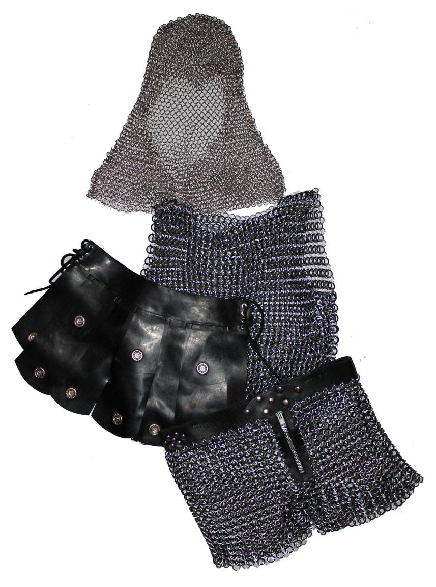 Four-piece chain mail ''armor'' costume, worn by Sacha Baron Cohen in the 2009 satiric comedy ''Bruno,'' in which Cohen played a hapless fashionista. Complete costume includes a chain mail hood, chain mail vest, chain mail shorts, and a pleated rubber skirt. Near fine condition.