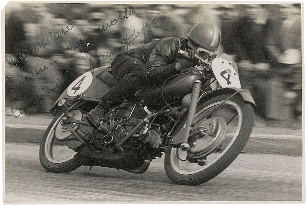 Italian Grand Prix motorcycle road racer (1920–2007). Exciting vintage glossy 6.75 x 4.5 photo of Ruffo during a race, signed and inscribed in Italian in fountain pen. In very good condition, with scattered surface dings and light creases, trivial paper loss to upper left corner tip, and moderate contrast to signature and inscription against the busy background.