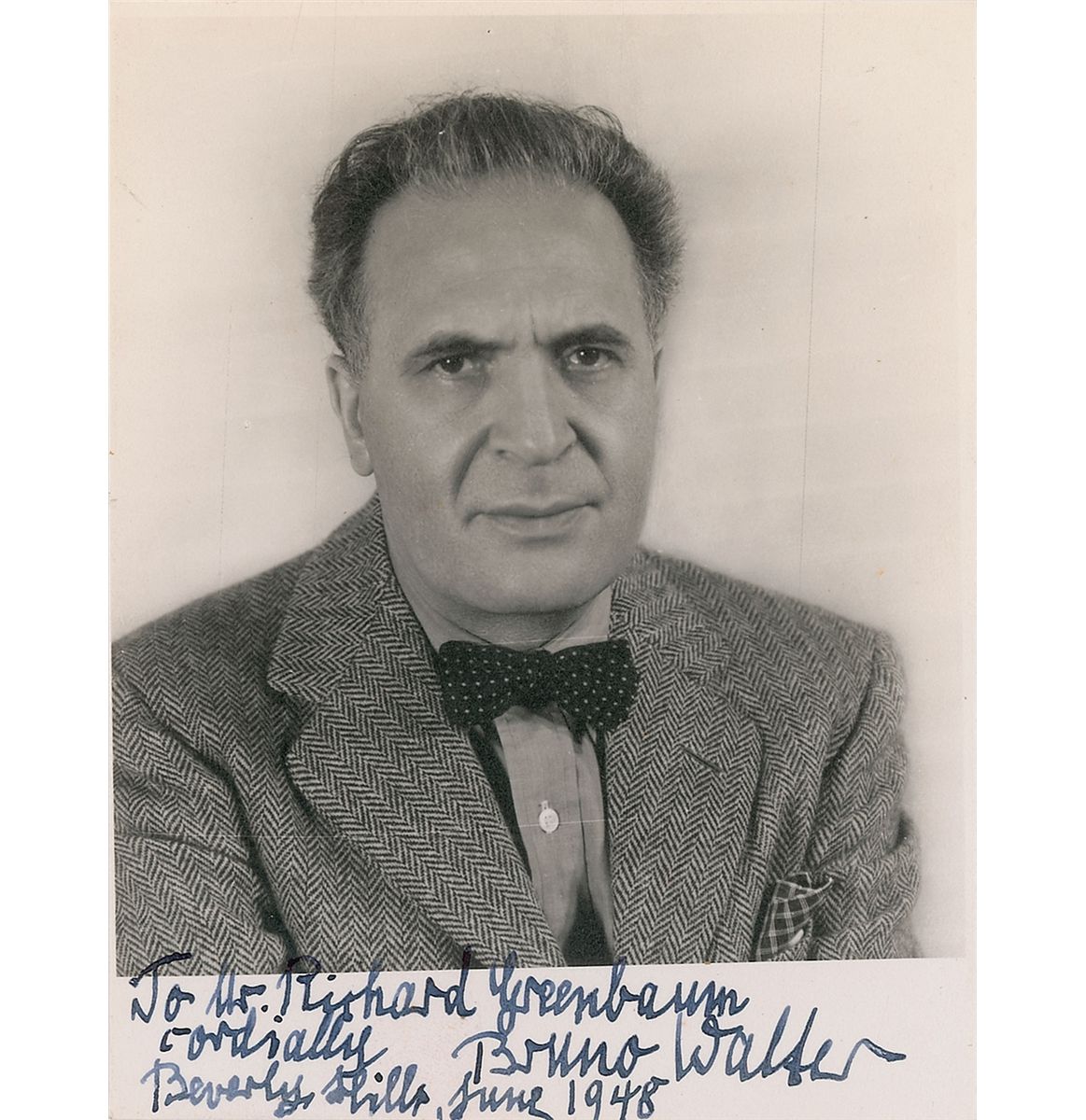 German-born conductor and composer (1876–1962). Uncommon matte-finish 3.75 x 4.75 photo of Walter in a handsome suit, signed and inscribed in fountain pen, “To Mr. Richard Greenbaum, cordially, Bruno Walter, Beverly Hills, June 1948.” In fine condition, with slightly trimmed edges.