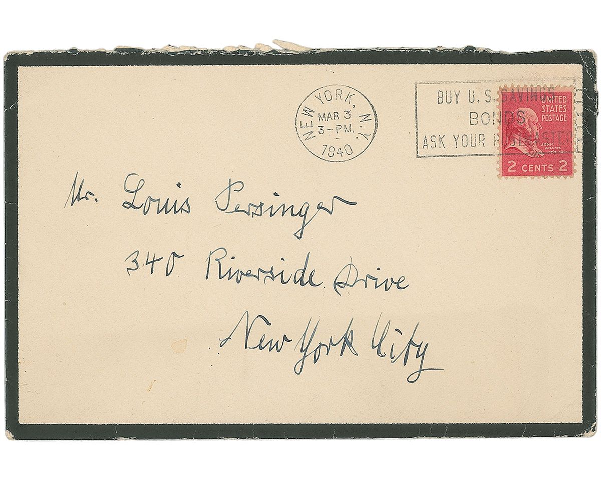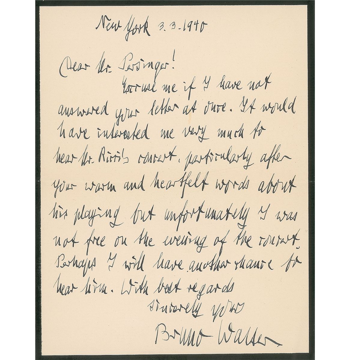 German-born conductor and composer (1876–1962). ALS, one page, 6 x 8, March 3, 1940. Letter to Louis Persinger. In part: “It would have interested me very much to hear Mr. Ricci’s concert, particularly after your warm and heartfelt words about his playing but unfortunately I was not free on the evening of the concert. Perhaps I will have another chance to hear him.” In fine condition. Accompanied by the original mailing envelope. Originates from the collection of American violinist and pianist Louis Persinger (1887–1966), who trained at the Leipzig Conservatory and later taught at Juilliard, mentoring the likes of Yehudi Menuhin, Ruggiero Ricci, and Isaac Stern. At this time the 22-year-old Ruggiero Ricci was under Persinger’s tutelage, and was coming into his own after having been regarded as a child prodigy; he went on to become a very prolific and successful violinist, considered the 20th century’s greatest performer of Paganini’s works. A wonderful letter associating these three important figures of classical music.
