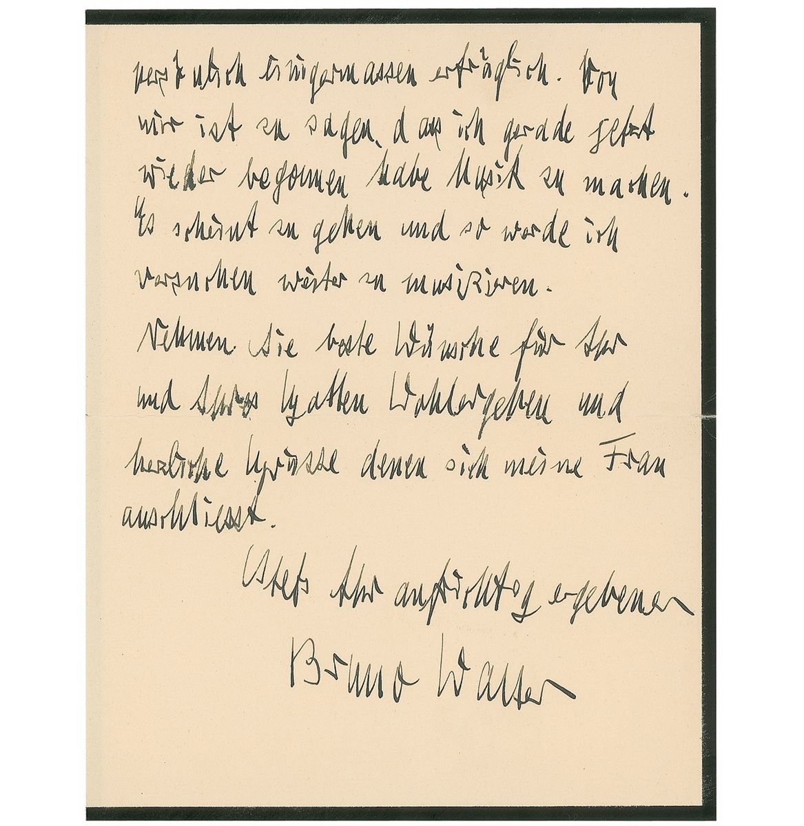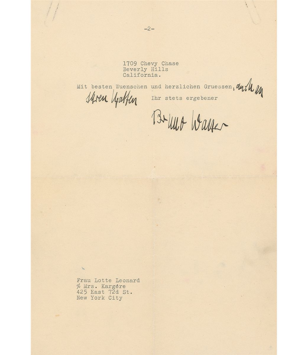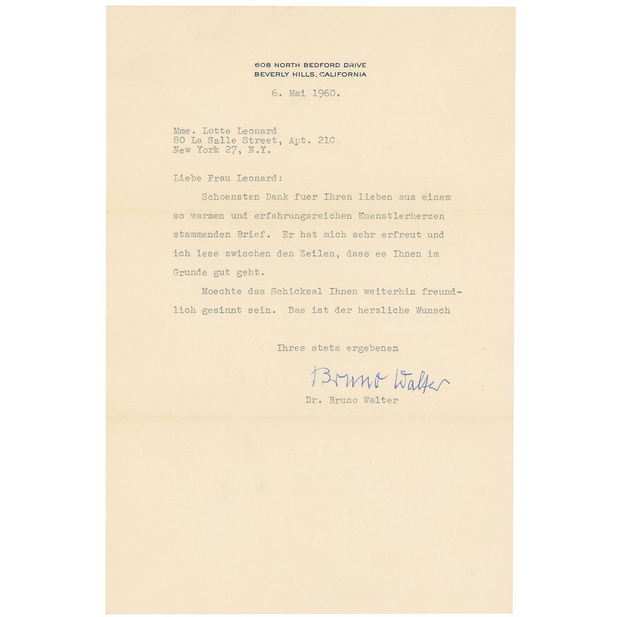 German-born conductor and composer (1876–1962). Collection of three letters in German, each signed “Bruno Walter,” consisting of one ALS and two TLSs, ranging in date from 1939–1960, all to Lotte Leonard. The ALS, written on black-bordered stationery, after the death of his daughter, reads, in part (translated): “I can say about myself that I’ve just started to make music again. It seems to work, so I will continue doing it.” Another letter, dated 1941, reads, in part (translated): “I wrote to the Emergency Rescue Committee in your interest…I cannot say for sure, however, if it really was the Emergency Rescue Committee or a similar one that I wrote concerning your case, as I was dealing with a lot of matters of this kind…I am of your opinion—that an apprenticeship at a college would be the best for you, and it would be the greatest pleasure for me to help you getting one.” In fine condition, with expected folds, and a couple of small notations and rusty paperclip mark to one letter.