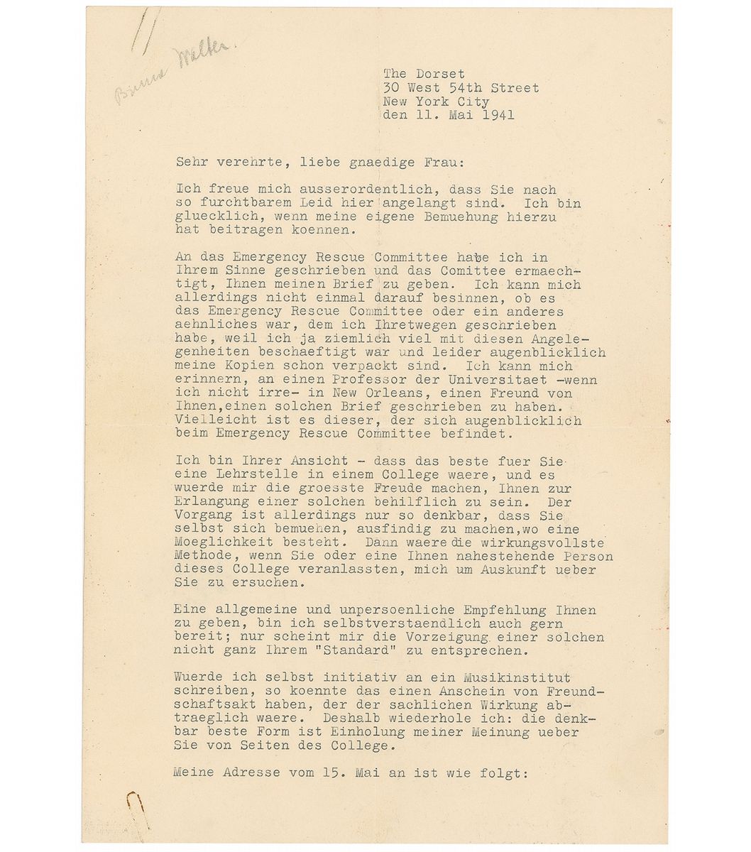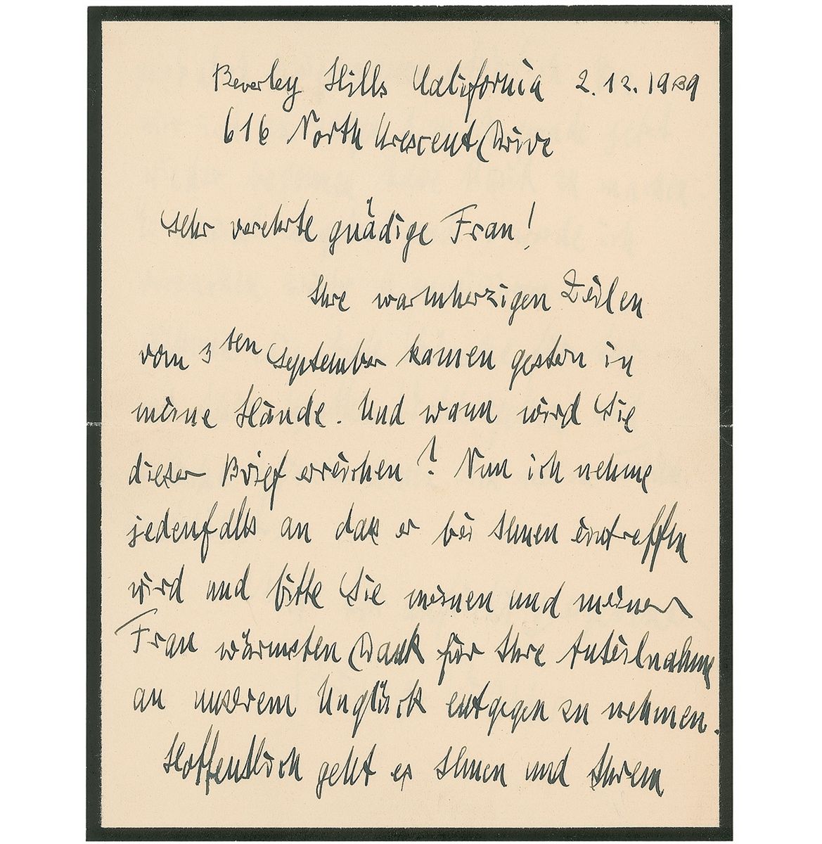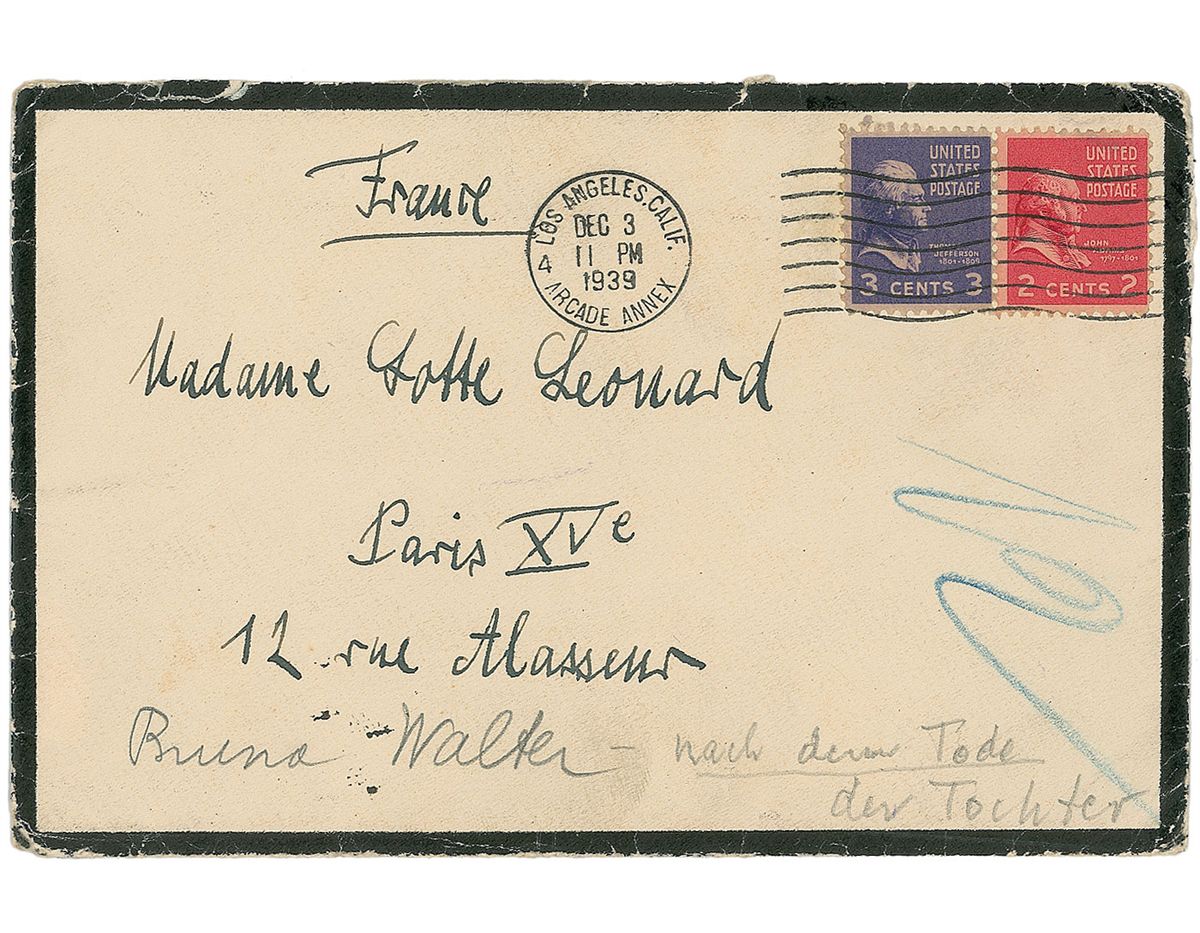 German-born conductor and composer (1876–1962). Collection of three letters in German, each signed “Bruno Walter,” consisting of one ALS and two TLSs, ranging in date from 1939–1960, all to Lotte Leonard. The ALS, written on black-bordered stationery, after the death of his daughter, reads, in part (translated): “I can say about myself that I’ve just started to make music again. It seems to work, so I will continue doing it.” Another letter, dated 1941, reads, in part (translated): “I wrote to the Emergency Rescue Committee in your interest…I cannot say for sure, however, if it really was the Emergency Rescue Committee or a similar one that I wrote concerning your case, as I was dealing with a lot of matters of this kind…I am of your opinion—that an apprenticeship at a college would be the best for you, and it would be the greatest pleasure for me to help you getting one.” In fine condition, with expected folds, and a couple of small notations and rusty paperclip mark to one letter.
