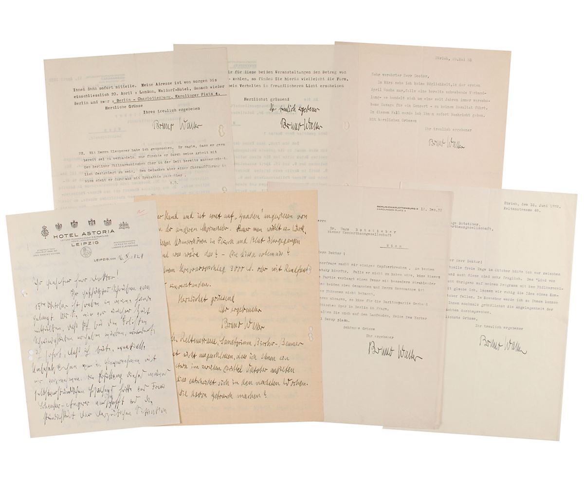 Collection of seven letters in German, including two ALSs and five TLSs, totaling eleven pages, dated from 1929 to 1933. All are to musicologist Hugo Botstiber, the secretary-general of the Vienna Concert Society. One, in part (translated): “With regard to the VIIIth of Mahler, so I can warn only after careful consideration before choosing this difficult work. If was so weak already prepared for seasons lightweight men's choir…Better to choose a work that has gone over this male voice choirs in flesh and blood. And what would that be?—The Missa Solemnis?” In overall fine condition, with filing holes to the left side and a few small edge separations.