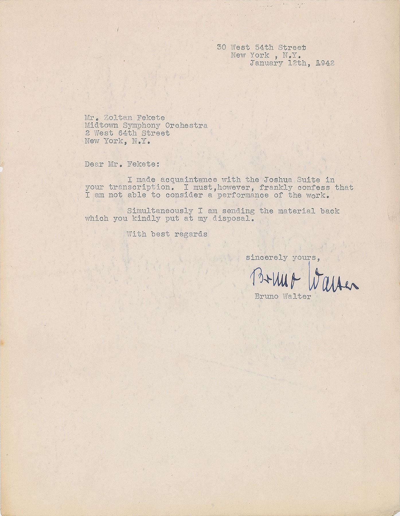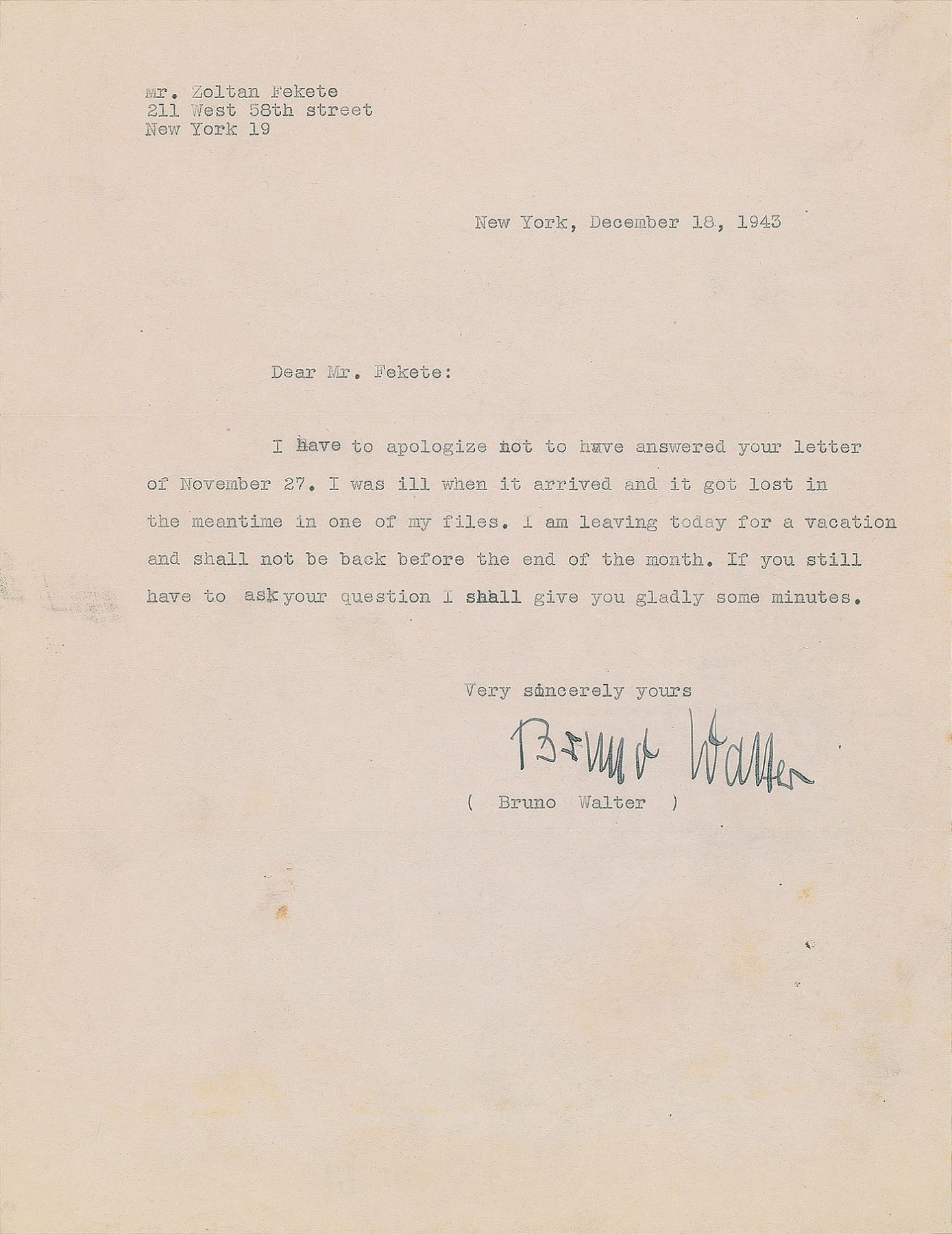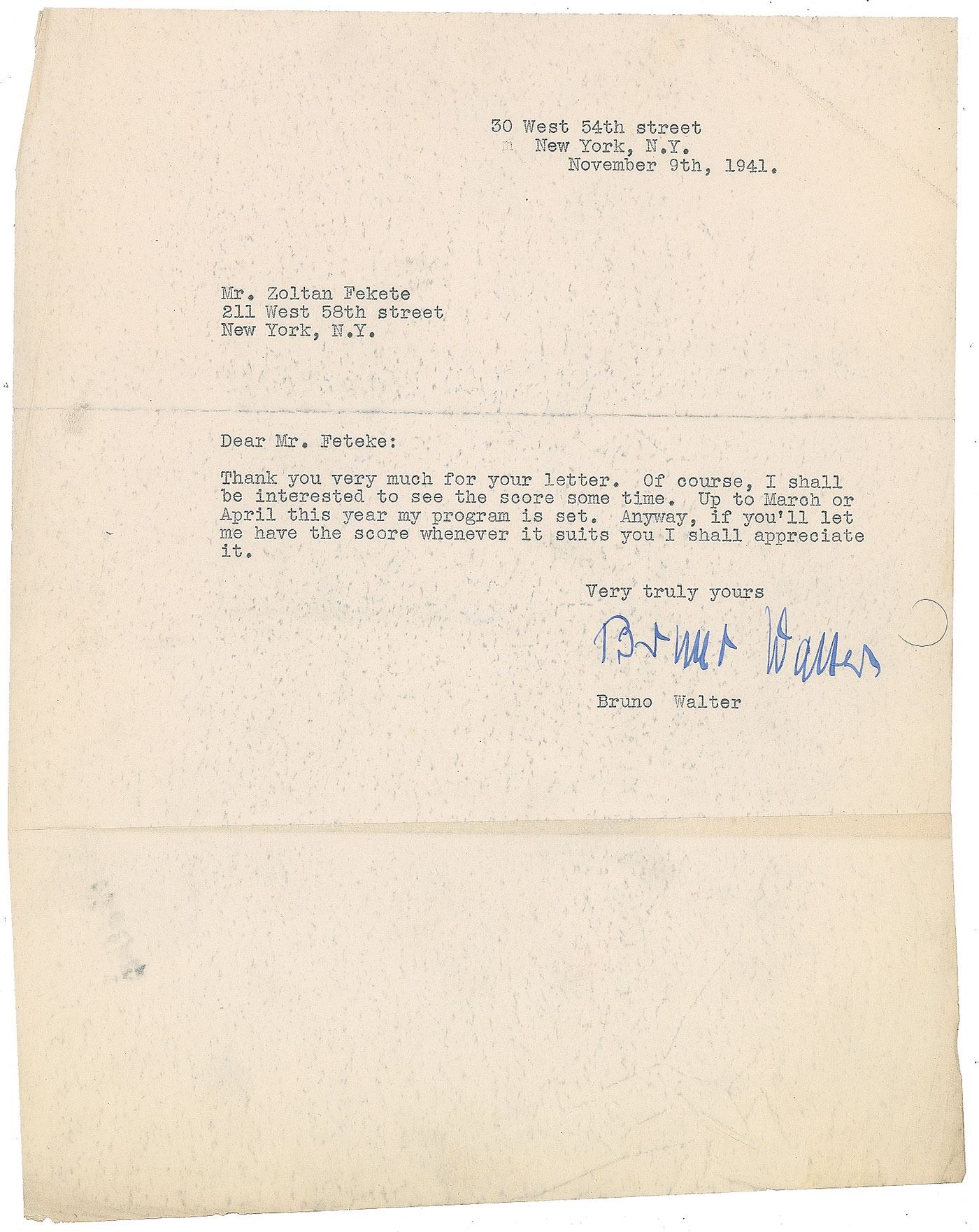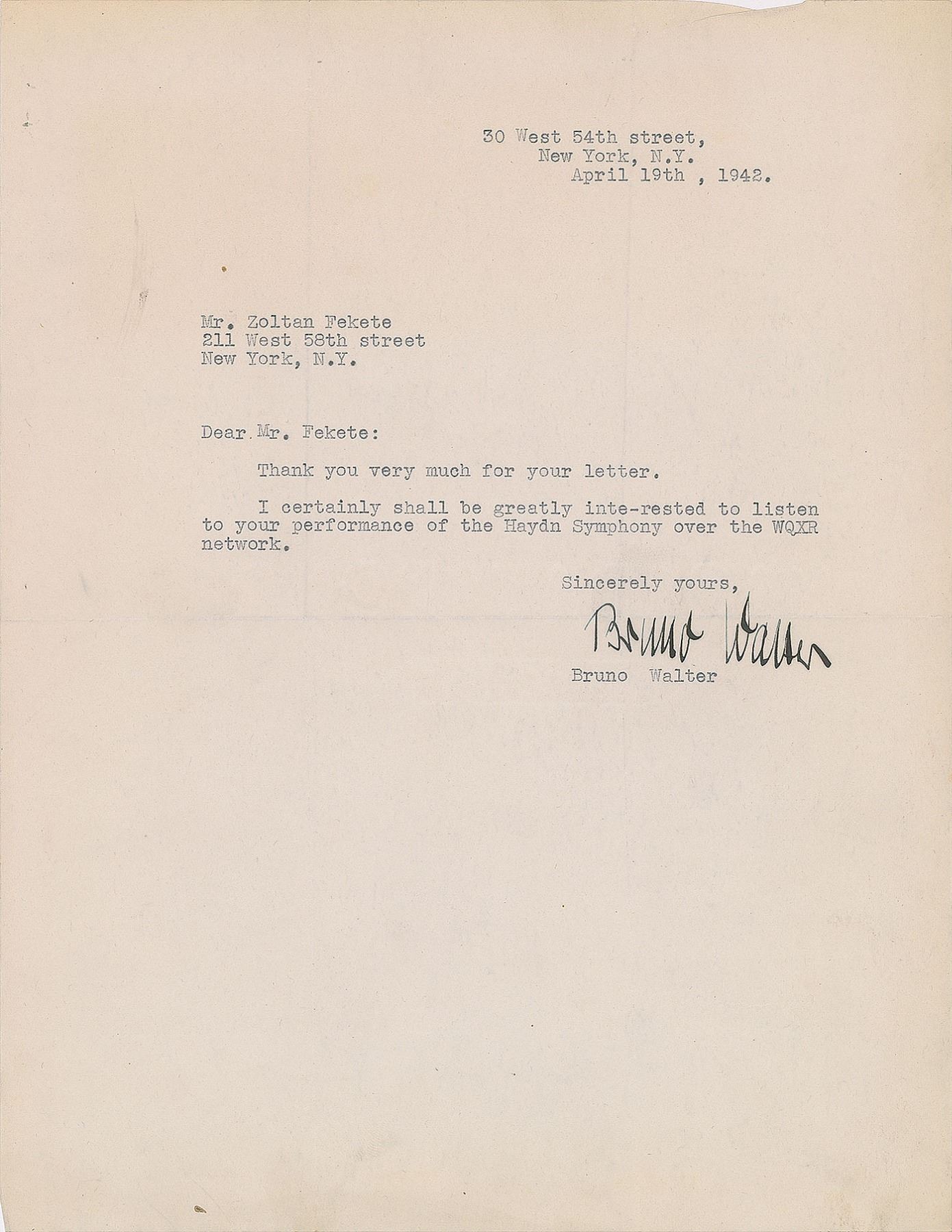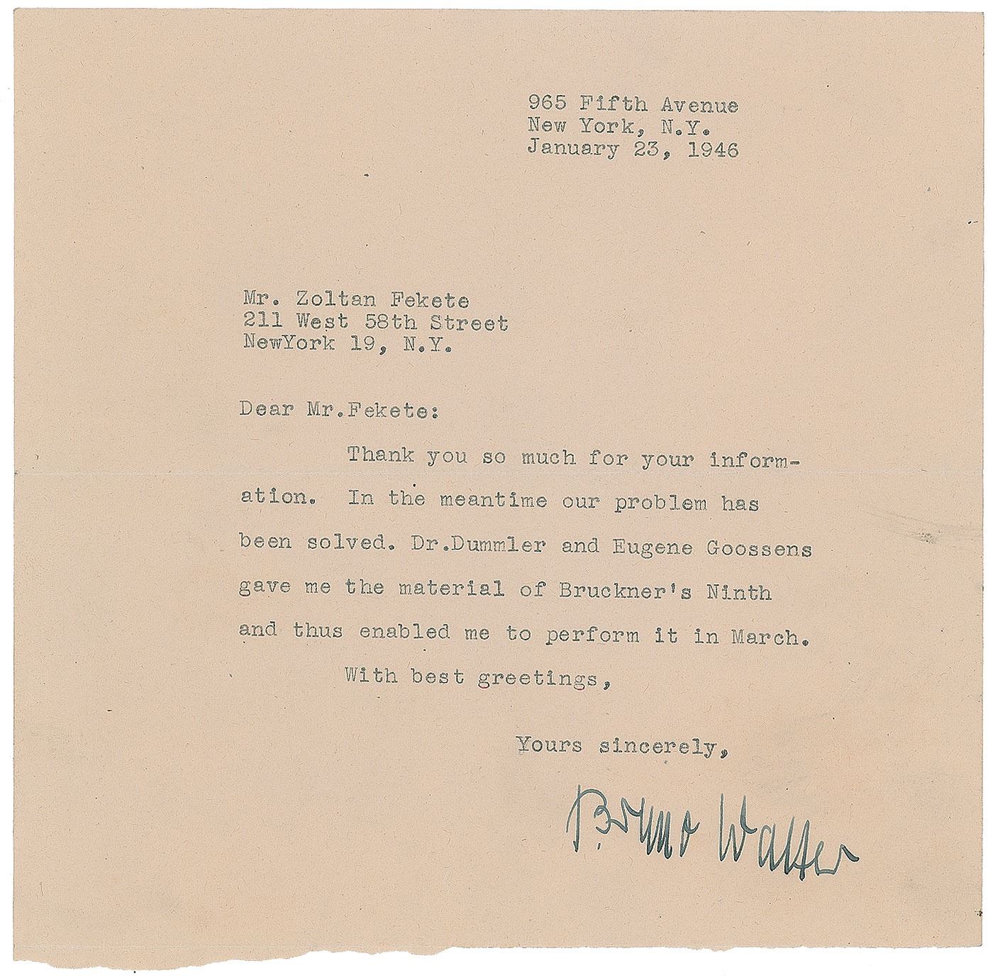 Five TLSs, each one page, ranging in size from 7.25 x 7.25 to 8.5 x 11, dated between 1941 and 1946, all addressed to the Hungarian-born conductor Zoltan Fekete. The first, November 9, 1941, in part: “I shall be interested to see the score some time. Up to March or April this year my program is set. Anyway, if you’ll let me have the score whenever it suits you I shall appreciate it.” The second, January 12, 1942, in part: “I made acquaintance with the Joshua Suite in your transcription. I must, however, frankly confess that I am not able to consider a performance of the work.” Another, April 19, 1942, in part: “I certainly shall be greatly inte-rested to listen to your performance of the Haydn Symphony over the WQXR network.” The fourth, December 18, 1943, in part: “I am leaving today for a vacation and shall not be back before the end of the month.” The final letter, January 23, 1946, in part: “Our problem has been solved. Dr. Dummler and Eugene Goossens gave me the material of Bruckner’s Ninth and thus enabled me to perform it in March.” In overall very good to fine condition.