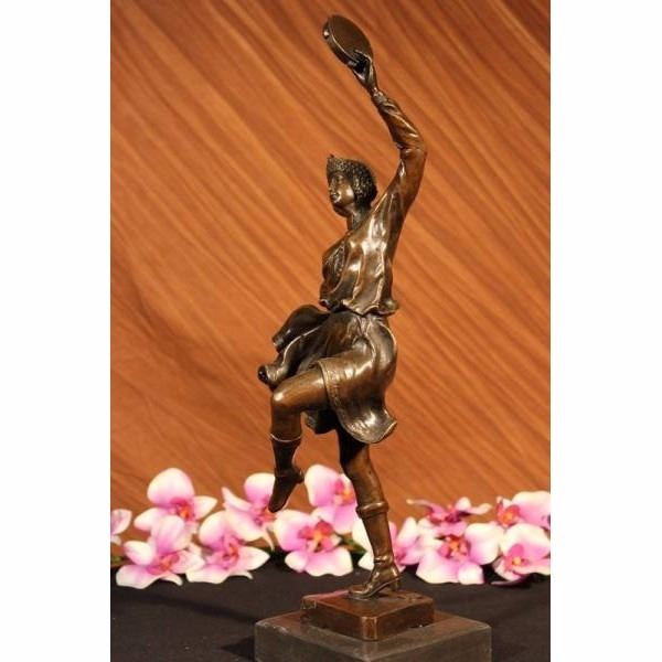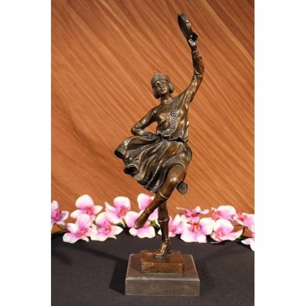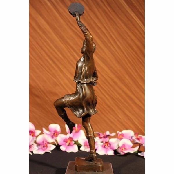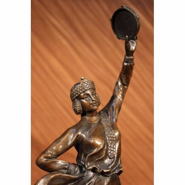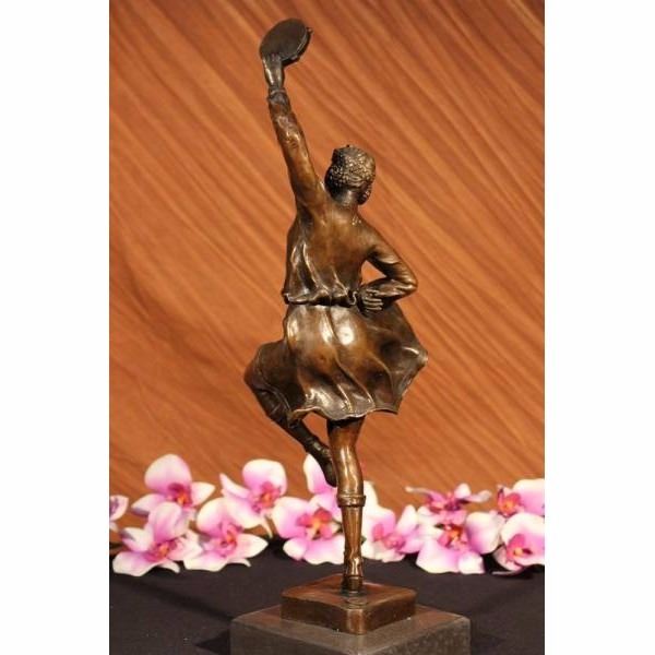This dancer rhythmically moves her body to the beat of her tambourine, enchanting all those who watch her performance. Her loose eloquent dress and minimal jewelry simply define her beauty. She moves foot by foot, allowing the wind to gently blow her dress, aiding the artist in conveying movement. This handmade 100% bronze sculpture was cast using the "lost wax method." This brown patina was mounted on a black marble base and is signed by the artist B. Zach. Condition: This sculpture is in perfect condition. Bronze Dimensions with Marble Base:Height 17" x Width 10" Marble Dimensions:5" X 5" Height without base: 16" Weight :10 LBS Inventory : 13Y7374131